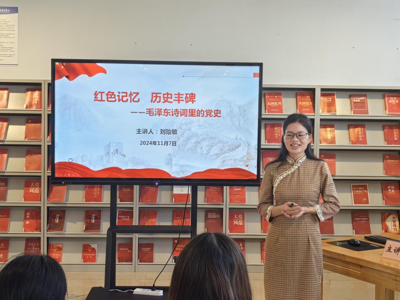 11月7日下午5:00,刘贻敏老师在图书馆三楼“红色阅读角”举办红色知识专题讲座,本期讲座的主题是红色记忆 历史丰碑——毛泽东诗词里的党史。我校舞蹈学院积极分子到场聆听讲座并参与互动,氛围良好,同学们纷纷表示受益匪浅。(张家梅摄)
