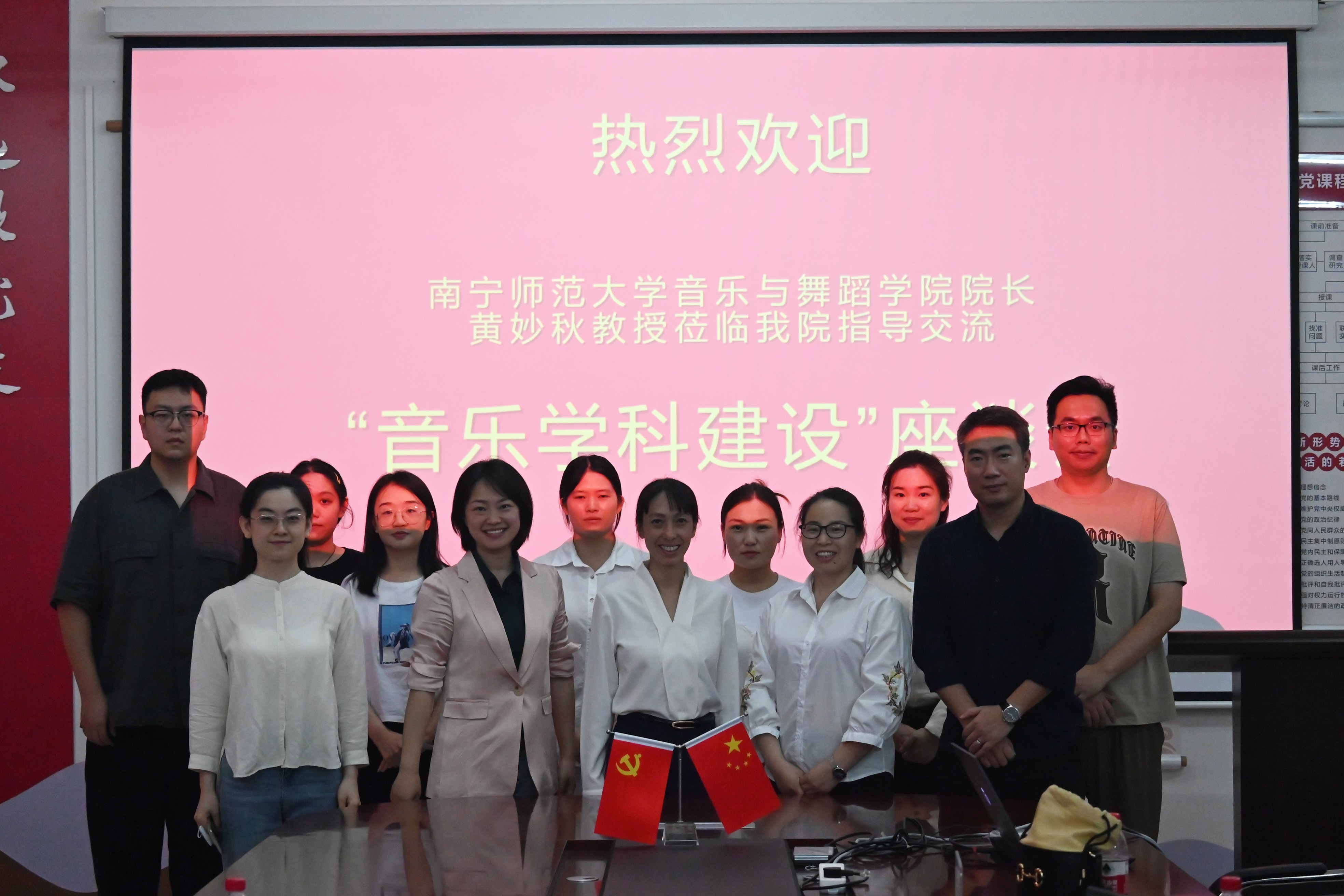 4月28日,南宁师范大学音乐与舞蹈学院院长、博士研究生导师黄妙秋教授受邀莅临我院进行交流。黄教授与我院部分教师进行了交流座谈,并参加了名师大讲堂专题授课。