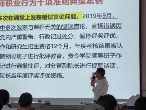另外,庞书记还着重强调教师是教学的第一责任人,在与学生日常交流、教学等过程中应注意言论、谨慎言语用词,课堂使用图片、案例等要严谨审核,避免产生不妥当的言论行为。身为高校教育工作者要自觉提高师德修养,规范自身行为,进一步提高自身思想和觉悟,增强教书育人的使命感和责任感。(杨明/摄)