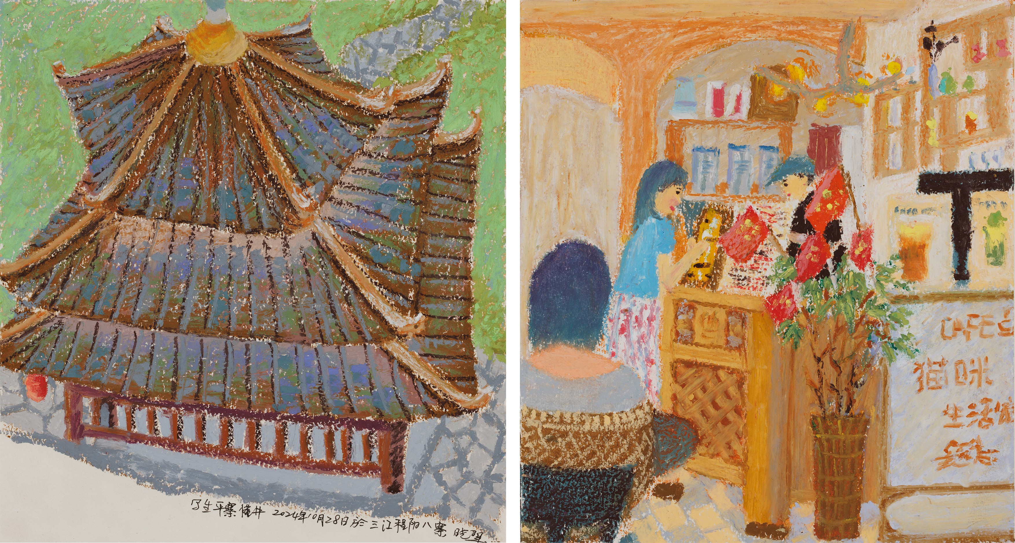 谢瑞,《窗口》《围茶》,30x15x2,蜡笔、水彩