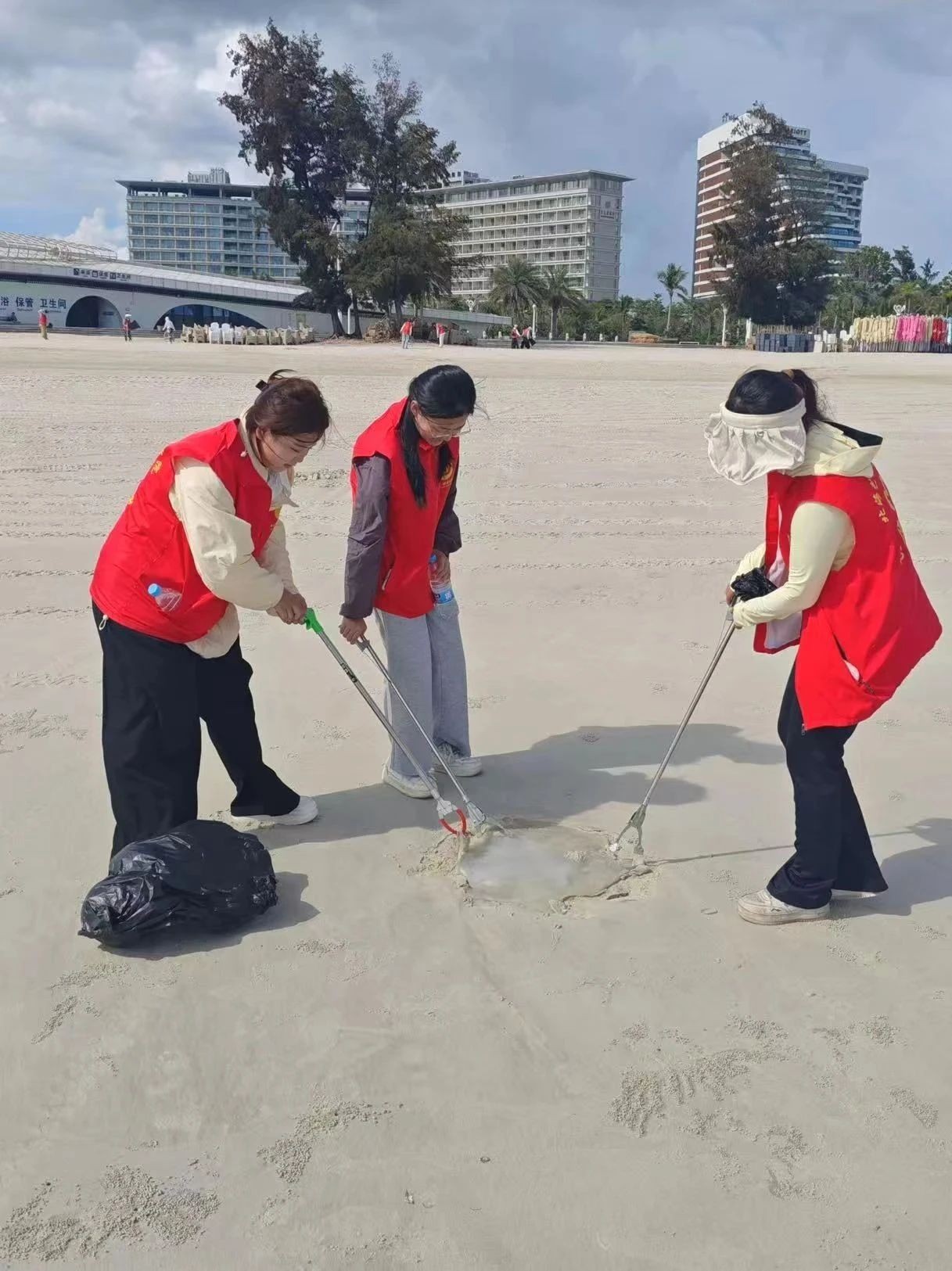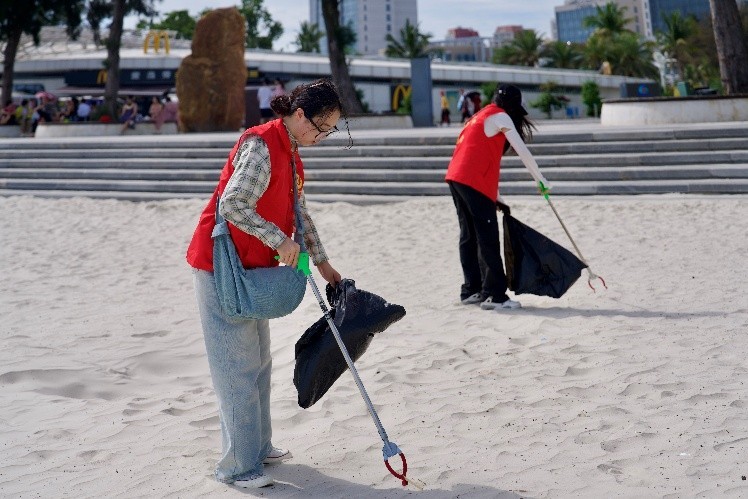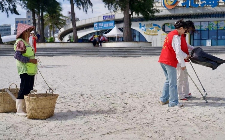 活动当天,在老师的分工下,各组领取清洁工具,为净滩行动做好充足准备。抵达银滩后,志愿者们迅速分头行动,手持工具,仔细搜寻每一处角落,将海滩上的塑料瓶、碎纸片、果皮等废弃物逐一“收入囊中”。他们互相配合,弯腰、捡拾、分类……动作重复却充满力量。烈日炎炎下,汗水浸湿了衣衫,但大家的热情丝毫不减。