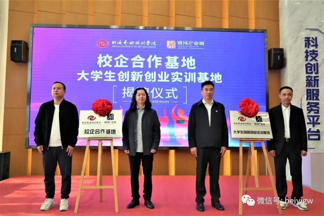 紧接着,北海艺术设计学院和银河产业城双方领导代表进行了校企合作签约仪式和校企合作基地、大学生创新创业实训基地揭牌仪式。