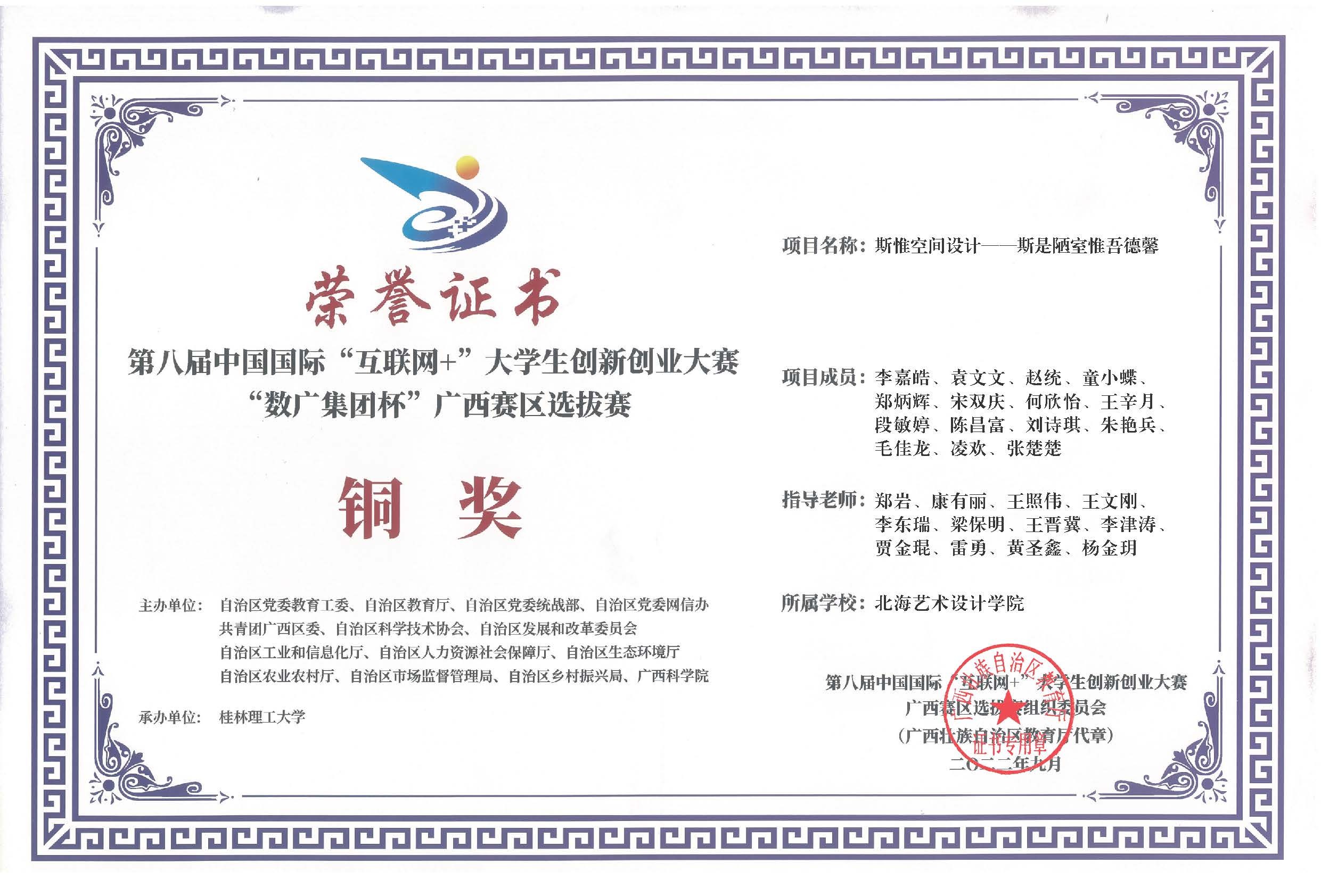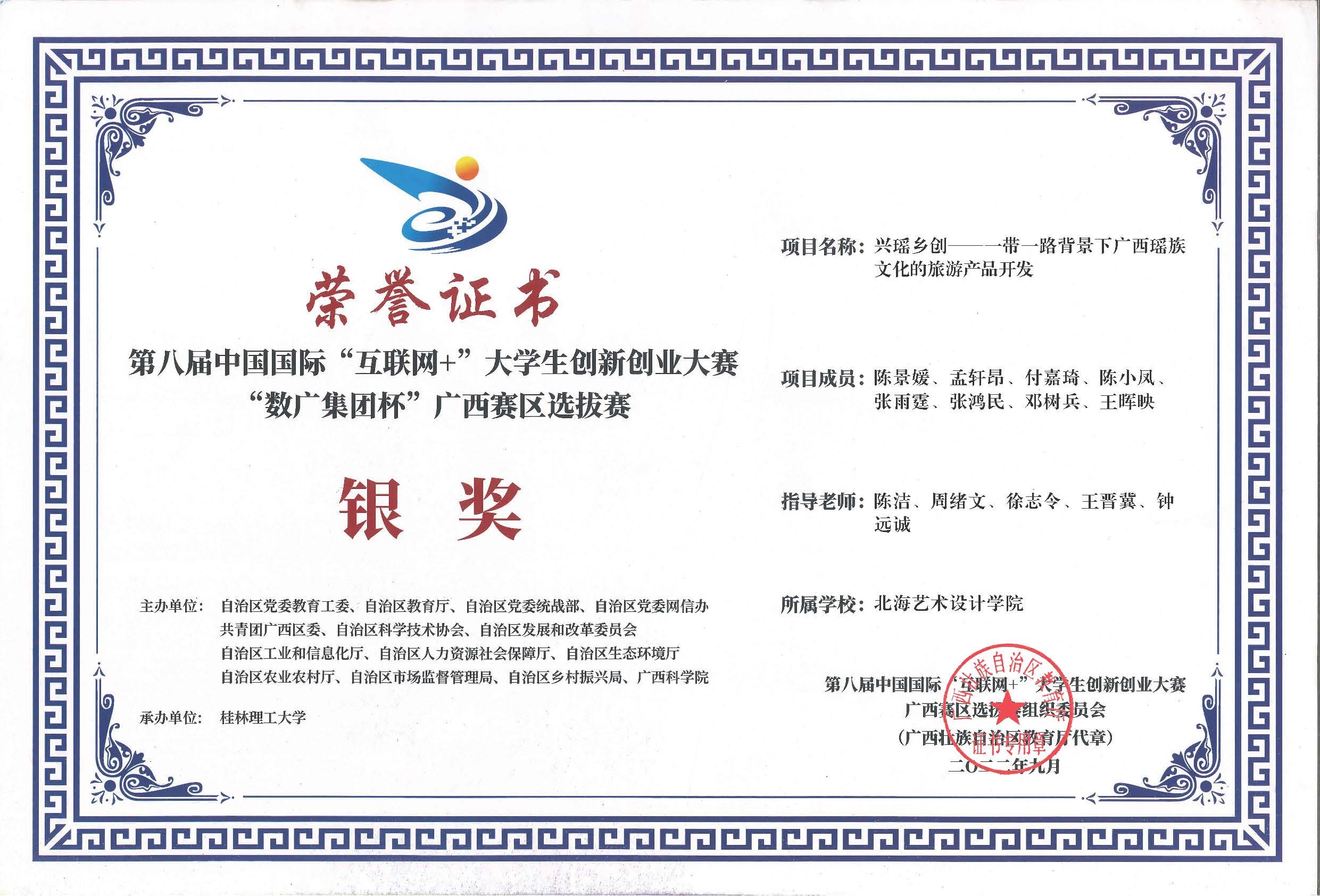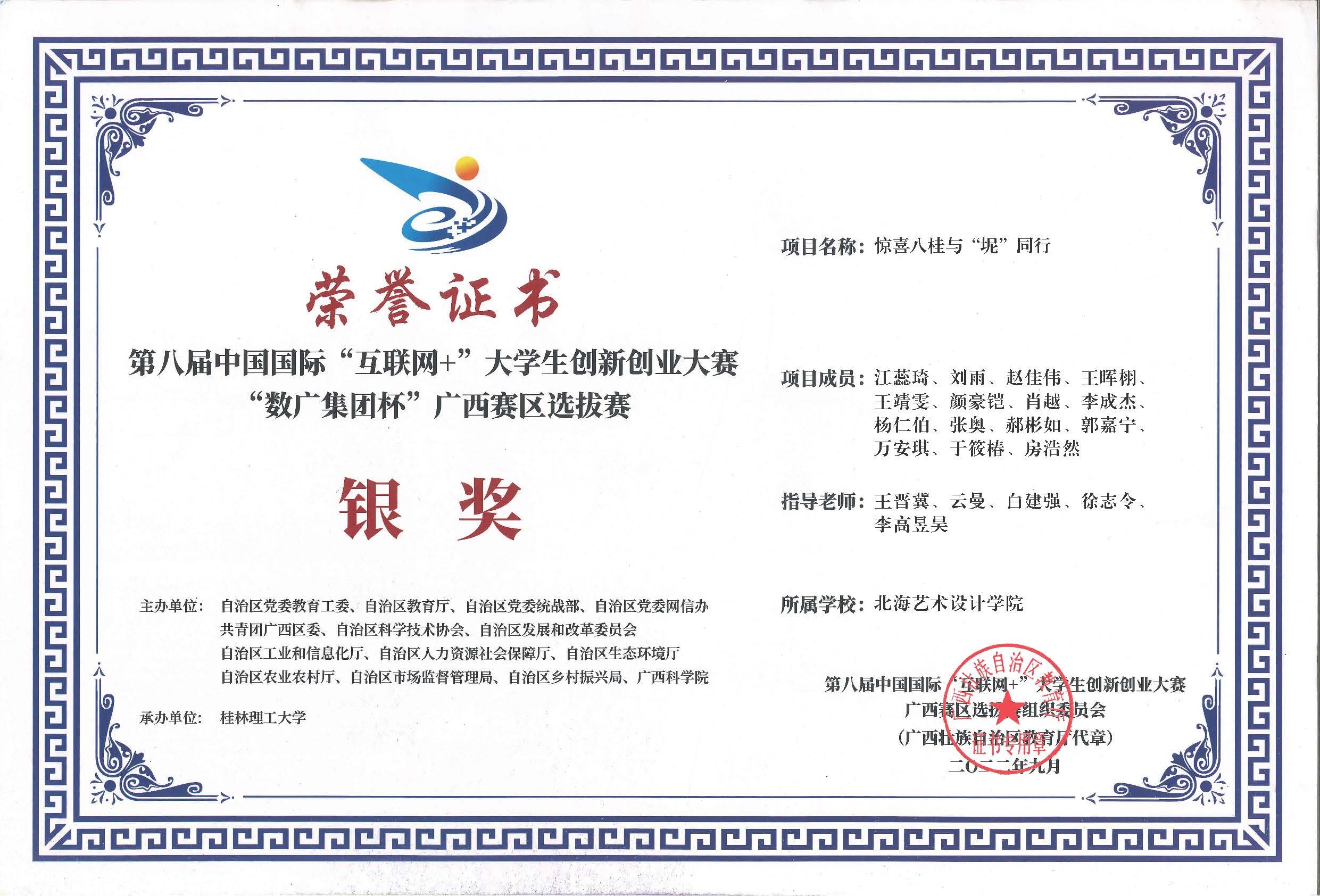 第八届中国国际互联网+大赛广西区获奖证书
