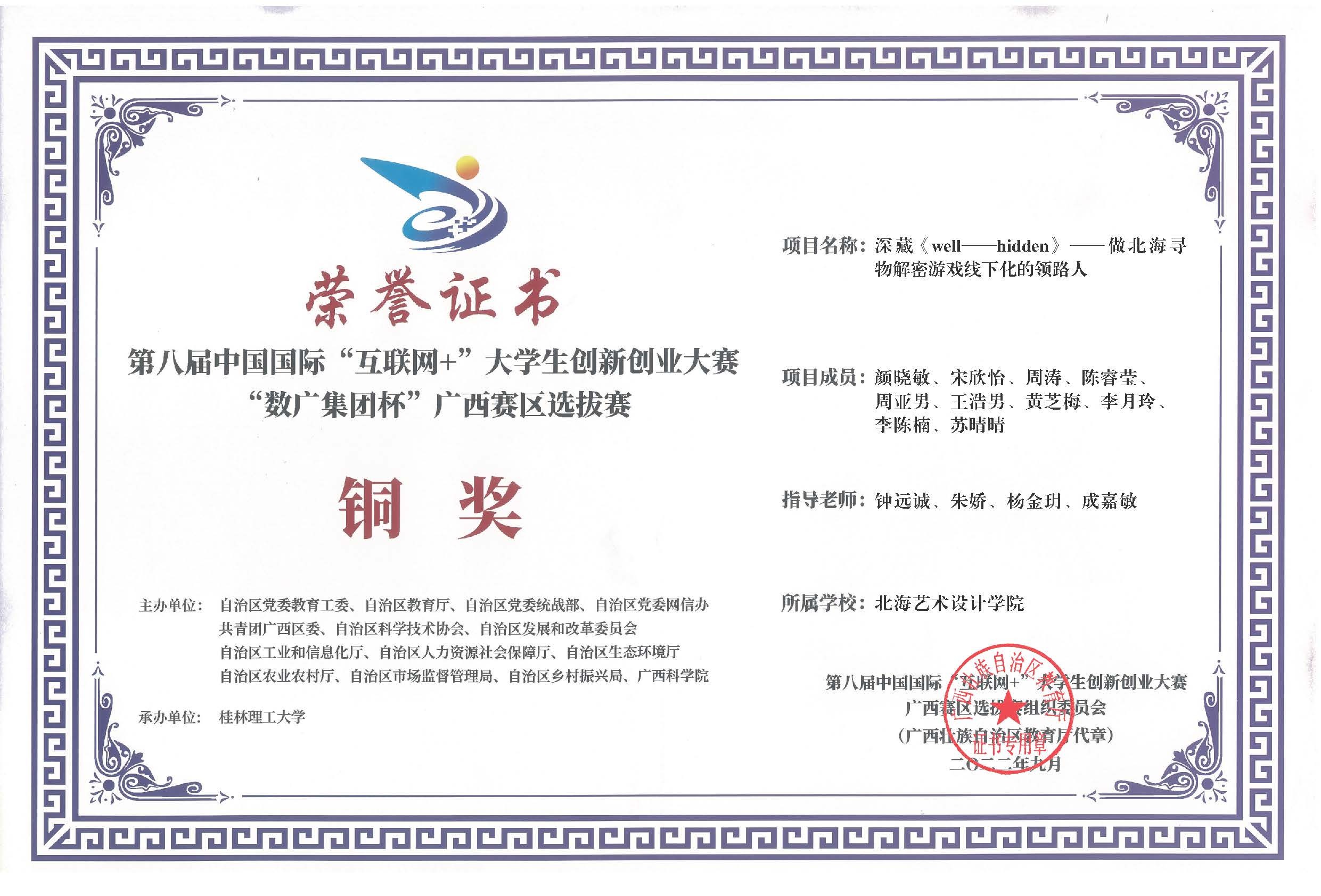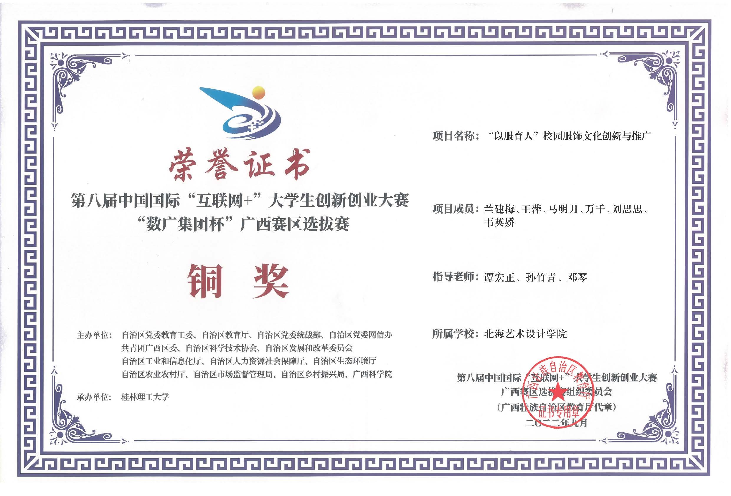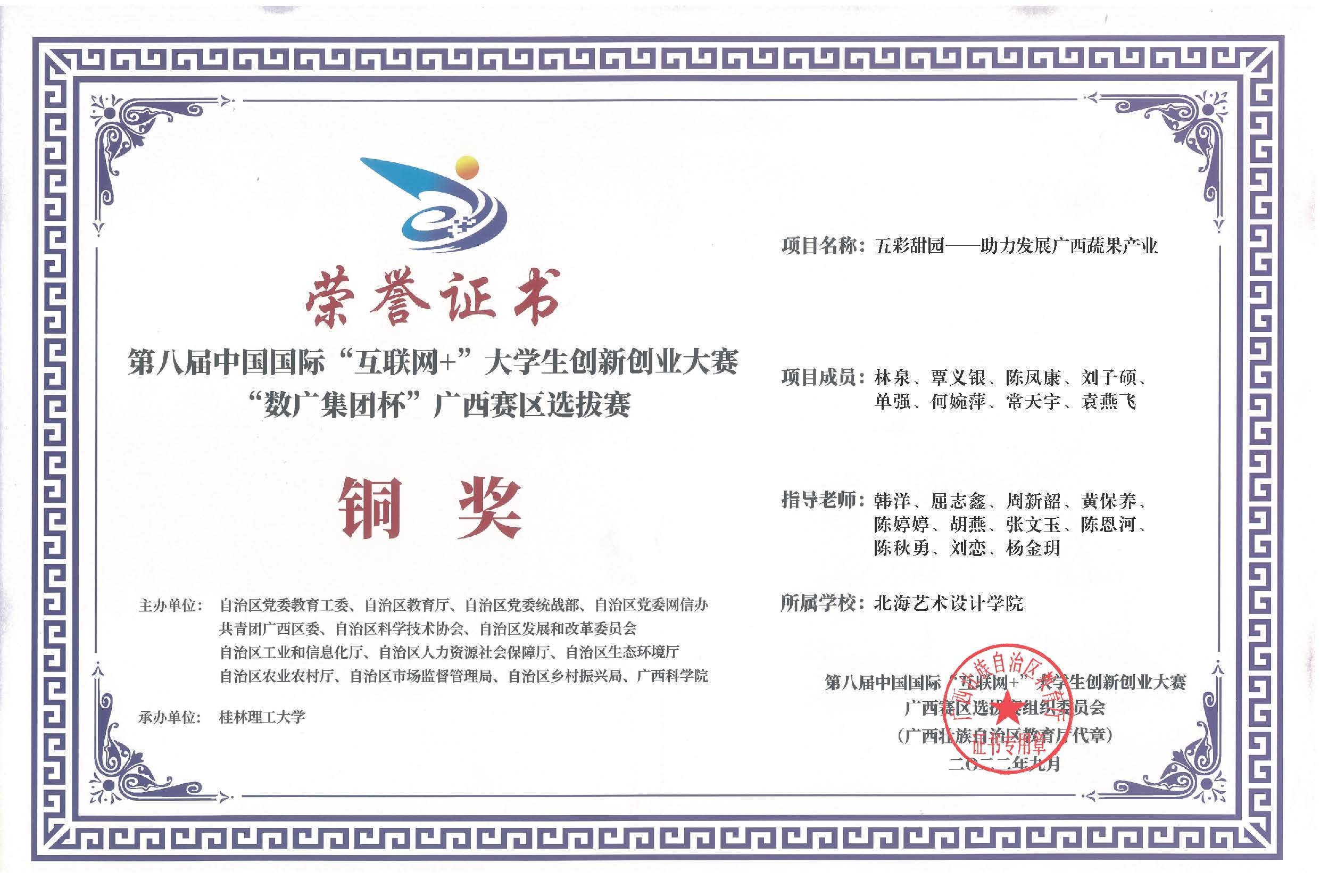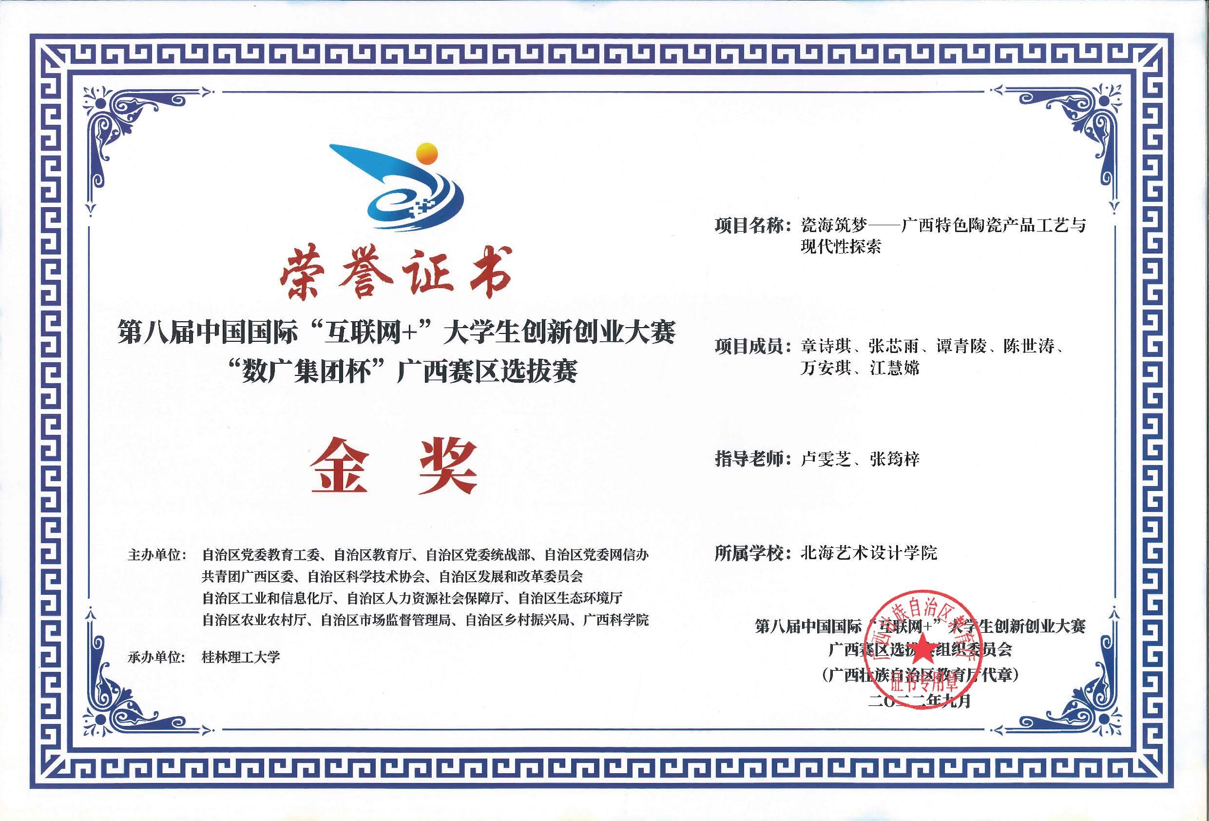 第八届中国国际互联网+大赛广西区获奖证书
