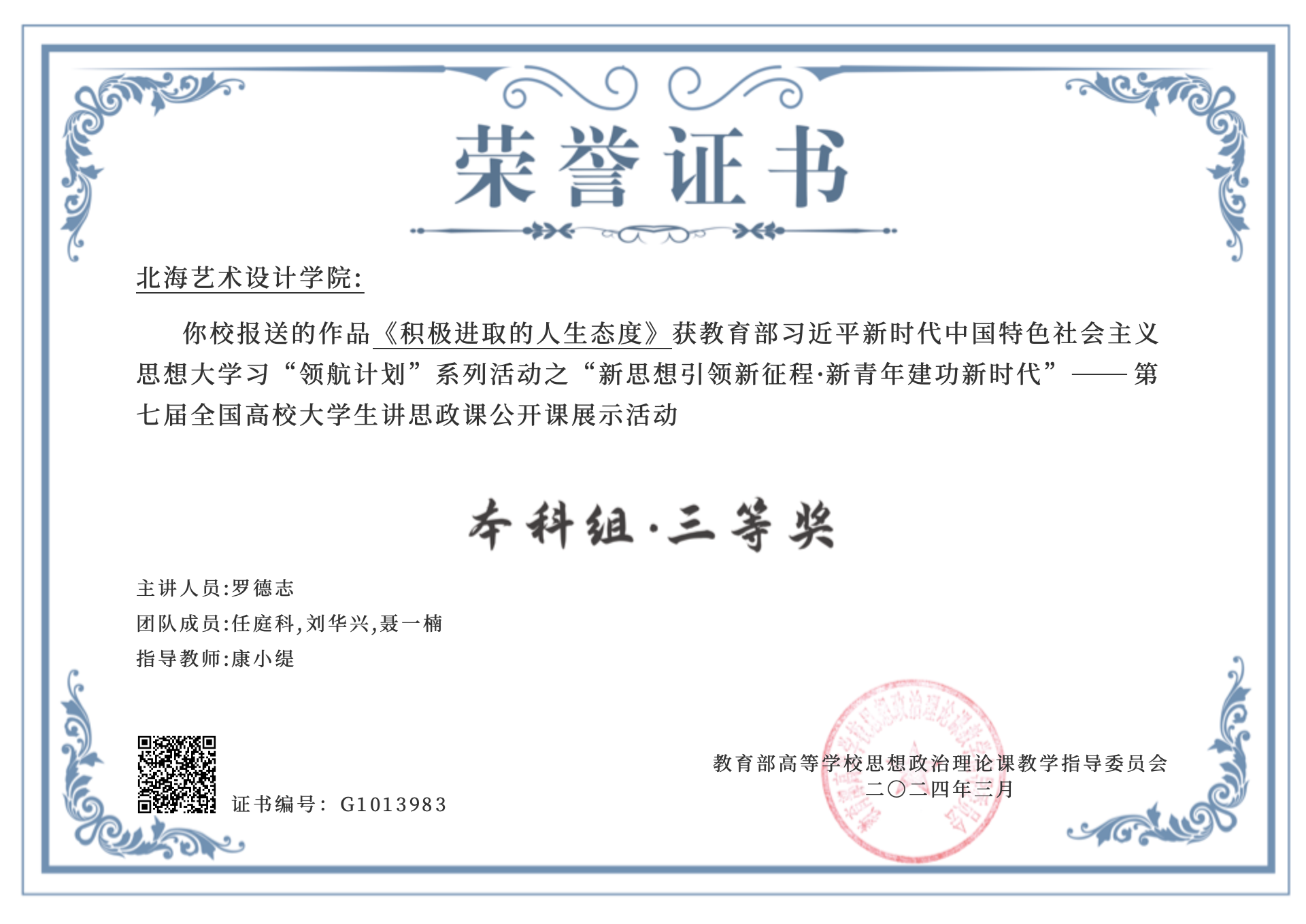 喜报:大学生讲思政课作品《积极进取的人生态度》荣获“新思想引领新征程·新青年建功新时代”第七届全国高校大学生讲思政课公开课展示活动本科组三等奖