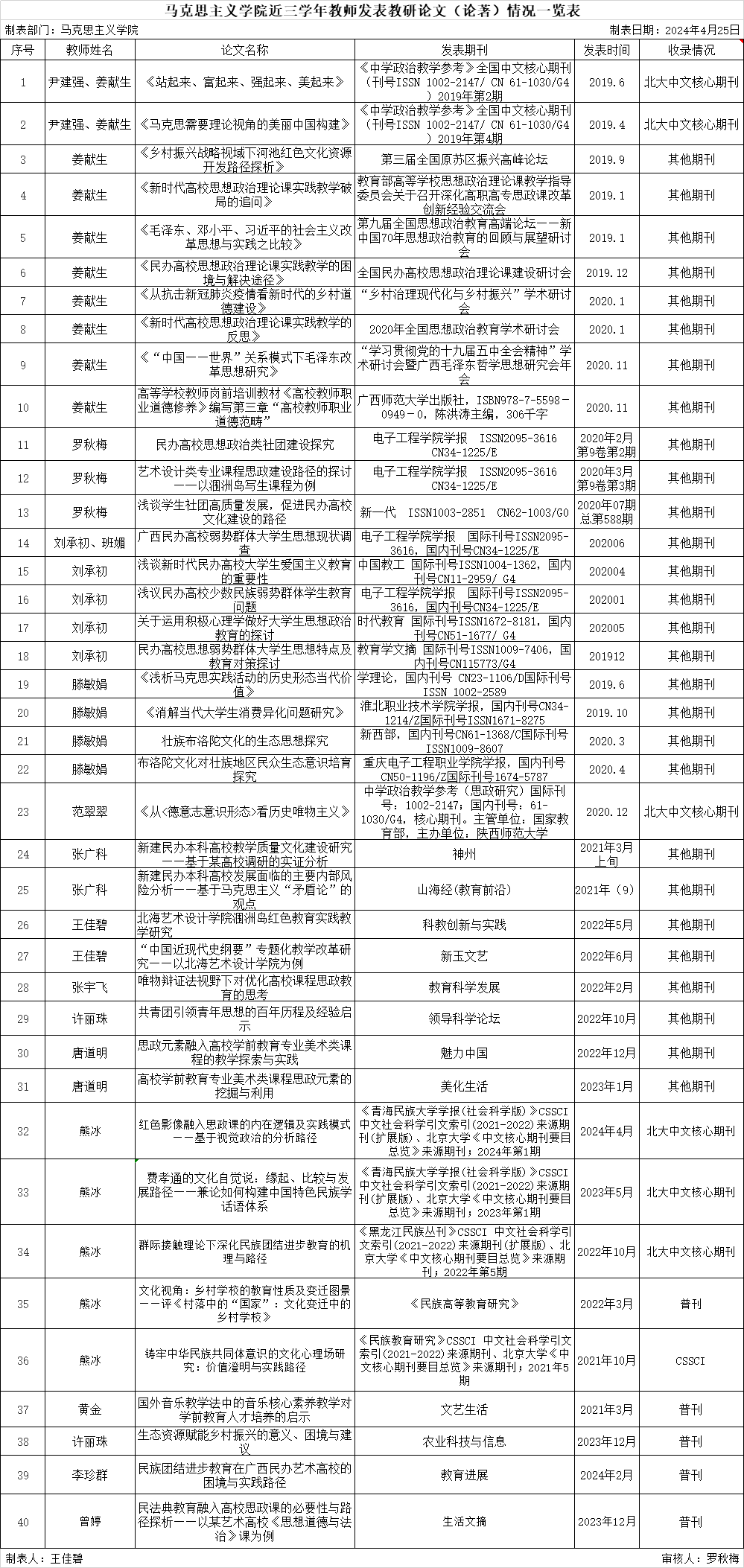 2024年马克思主义学院教师发表教研论文(论著)情况一览表(汇总)