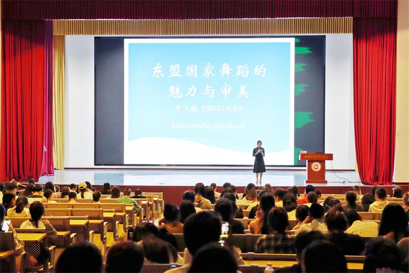 11月2日晚,广西民族大学舞蹈学科带头人、一流课程负责人李锐飞教授应邀于我校西校区大礼堂为广大师生带来了一场题为《东盟国家舞蹈的魅力与审美》的精彩讲座。