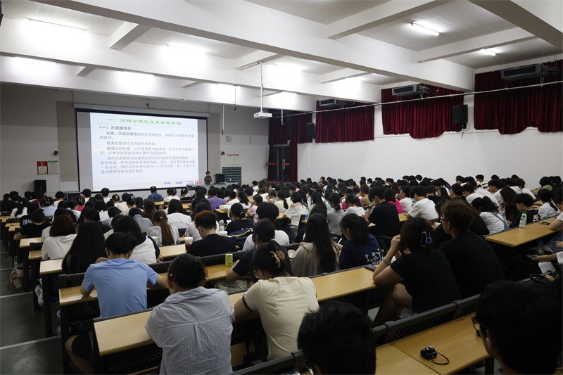 讲座过程中,黄昭艳教授以汉语言规范及其素养所指为例,为现场师生生动讲述了现代汉民族共同语规范的概念。普通话的标准是以北京语音为标准音,以北方话为基础方言,以典范的现代白话文著作为语法规范。黄教授表示,现代汉语规范化就是确立现代汉民族共同语明确的、一致的标准,并用这种标准消除语音、词汇、语法等方面存在的一些分歧,同时对它的书写符号一文字的形、音、义各个方面也要制定标准进行规范。