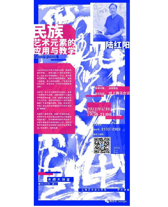 2022年5月10日,广西艺术设计学院教学名师陆红阳教授应邀为我校开展题为民族艺术元素的应用与教学”的线上讲座。讲座由设计艺术学院李林平院长主持。