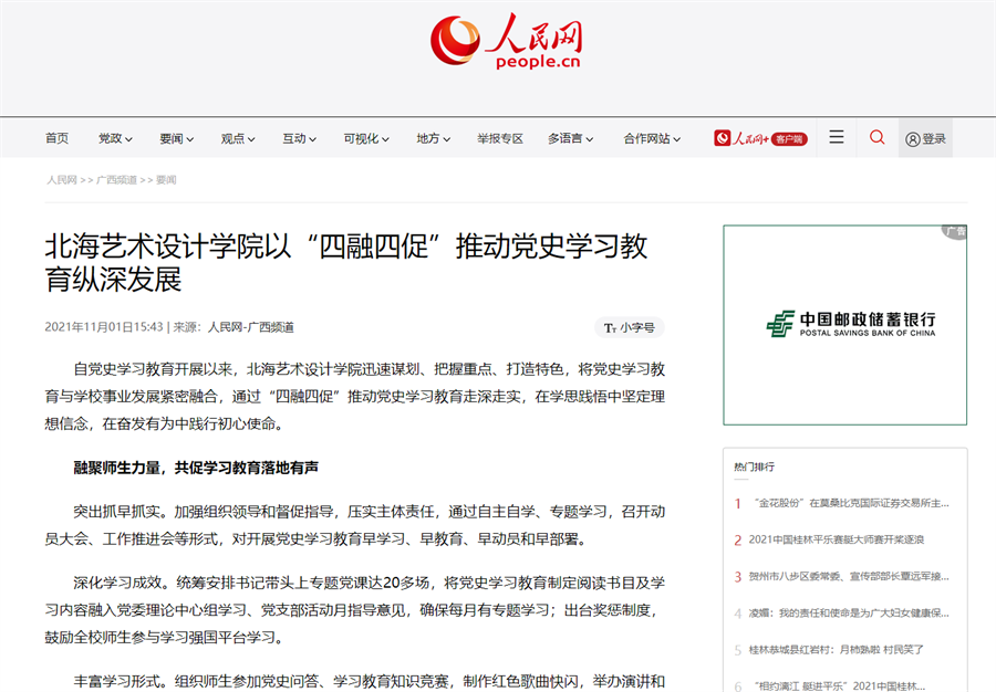 11月1日,人民网以《北海艺术设计学院以“四融四促”推动党史学习教育纵深发展》为题,报道我校通过“四融四促”推动党史学习教育走深走实。自党史学习教育开展以来,我校谋划重点,打造特色,将党史学习教育与学校事业融合发展,成效显著。