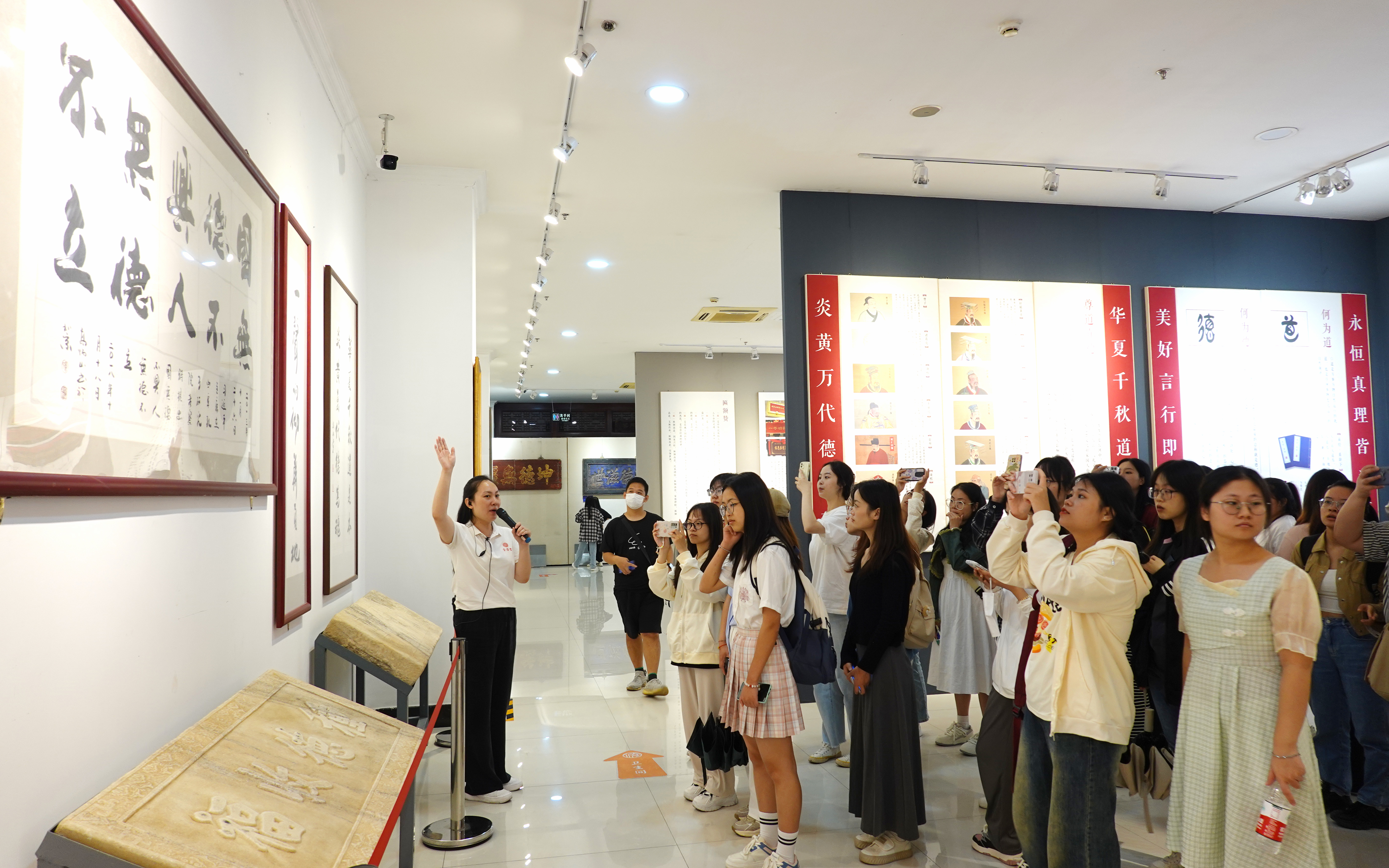 随后,博物馆的工作人员带领我院师生走进了一场历史悠久的文化盛宴。工作人员讲述崇德堂博物馆自创办以来便从全国各地征集道德文化匾额,迄今为止,匾额藏量已多达四百余块;接着又讲述了李馆长为了博物馆的发展而搜集千余幅当代书法名家道德书法作品以及200余方当代篆刻名家篆刻作品的经历;最后又带领学生欣赏了馆内500余张由夏商周至秦汉时期的蕴涵“德”子的拓片作品。这些优秀的作品都承载着“道德”文化,是我国优秀传统文化精神的缩影,为我院学生提供了近距离感知历史文化知识、领略中国民族文化魅力的极佳窗口。
