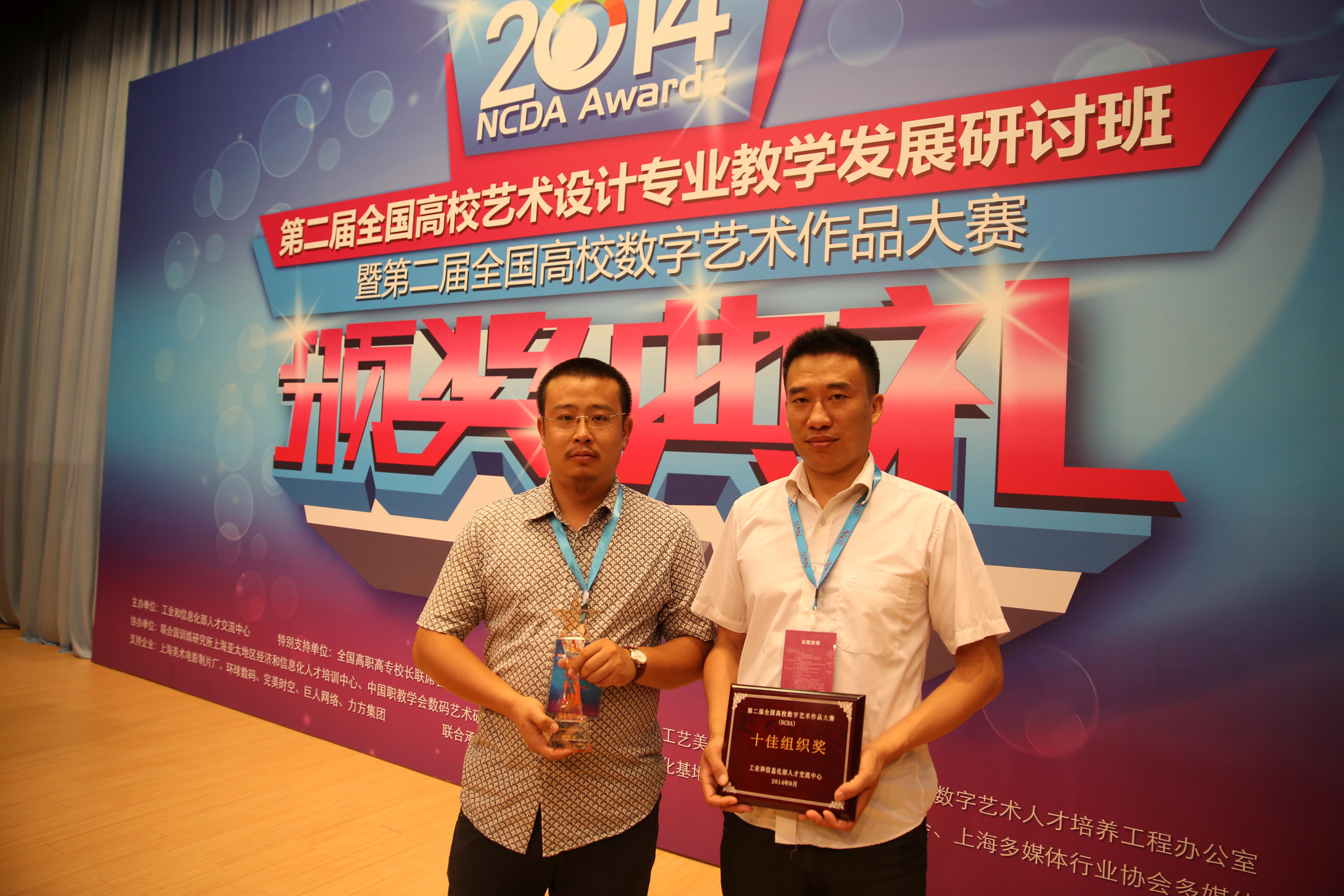 2014年8月8日 “第二届全国高校艺术设计专业教学发展研讨会暨第二届全国高校数字艺术作品大赛颁奖典礼”在上海开幕。陶立阳、武鹏程两位老师受邀出席颁奖典礼并发言。在本次赛事中我院共参加了动画设计等六个类别的作品比赛。其中荣获“院校十佳组织奖”、“特等奖”1个、“一等奖”3个、“二等奖”6个、“三等奖”7个的可喜成绩。