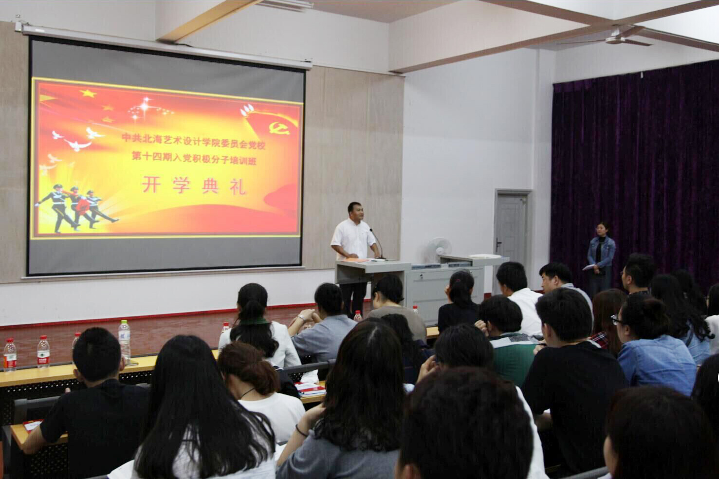 中共北海艺术设计学院委员会党校第十四期入党积极分子培训班开学典礼于2016年3月20日19:30分别在学院学院西校区公德楼和伦理楼隆重举行。学院党委副书记、副院长林秀琪、彭仁,以及学院党委委员、直属各部门、各二级学院党总支、党支部负责人应邀出席开学典礼。