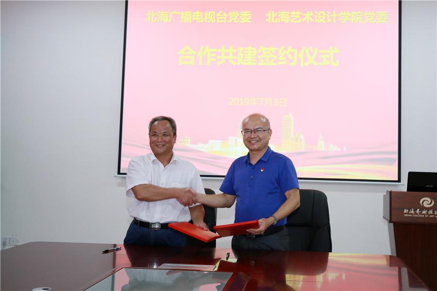 当天下午,北海广播电视台40多名党员,在高峰台长、唐立鹏、谢跃平、唐燕玲副台长的带领下,来到我校,他们首先参观了我校校园和师生美术作品、设计作品展览,观看了我校动画学院师生制作的动画片集锦,随后与我校的部分党员进行了座谈。座谈会后,我校党委书记李高南和北海广播电视台党委副书记、副台长唐立鹏作为双方代表签订党建合作共建协议书。