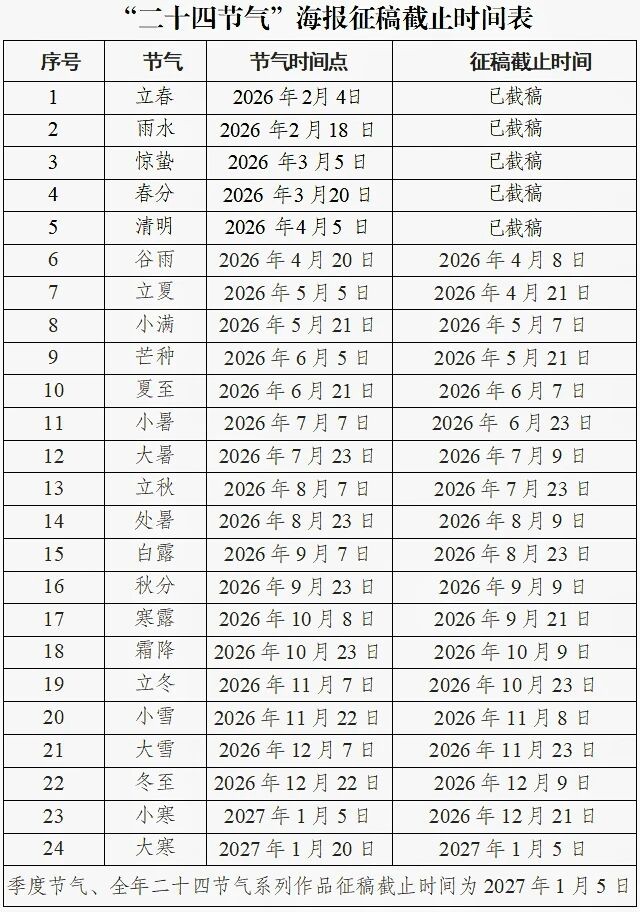 单个节气征集截止时间详见“二十四节气”海报征稿截止时间表,系列节气海报征集截稿时间为2027年1月5日。