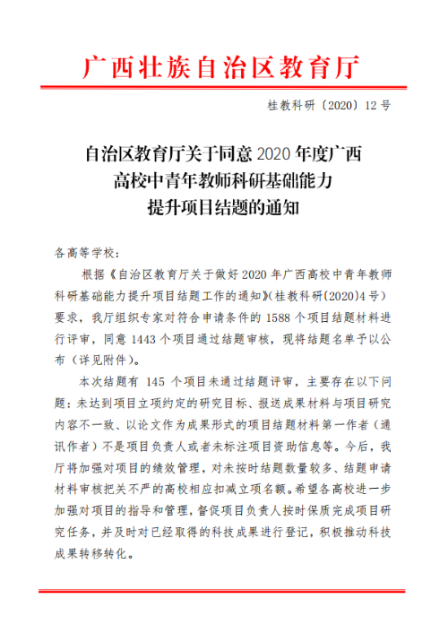 自治区教育厅关于同意2020年度广西高校中青年 教师科研基础能力提升项目结题工作的通知