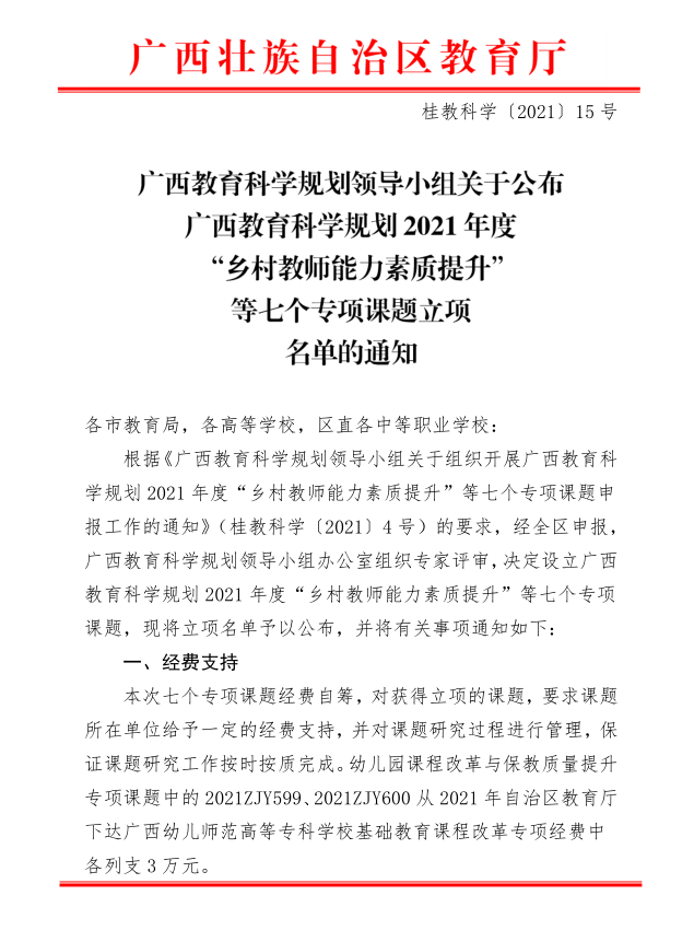 广西教育科学规划领导小组办公室关于公布广西教育科学规划2021年度“乡村教师能力素质提升”等七个专项课题立项名单的通知