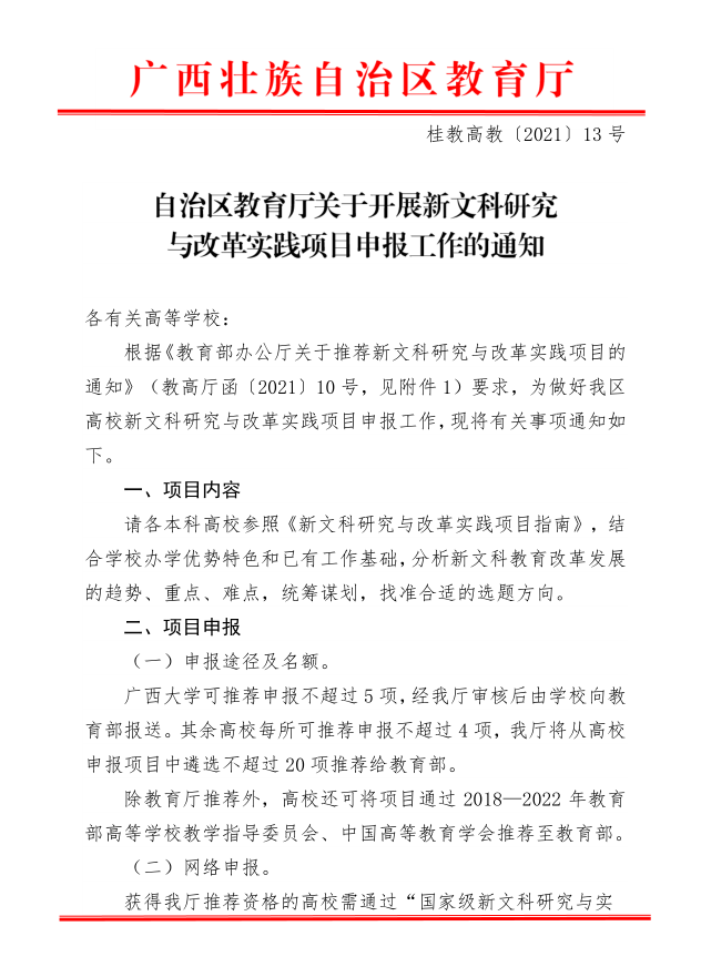 自治区教育厅关于申报2021年度 广西高等教育本科教学改革 工程项目的通知
