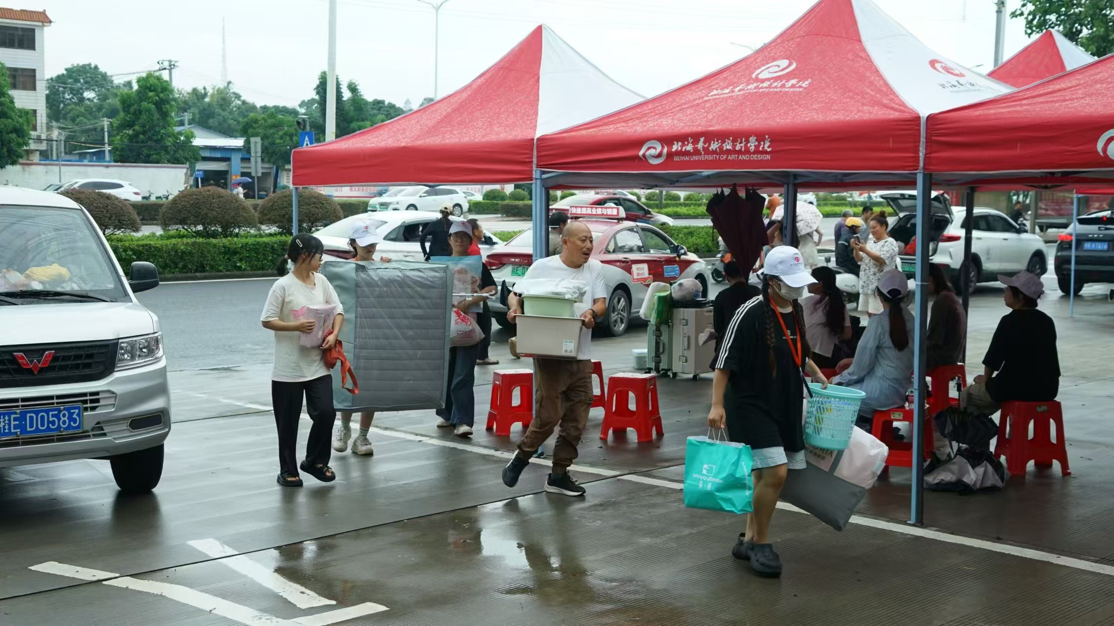面带微笑的迎新志愿者已经忙碌起来。