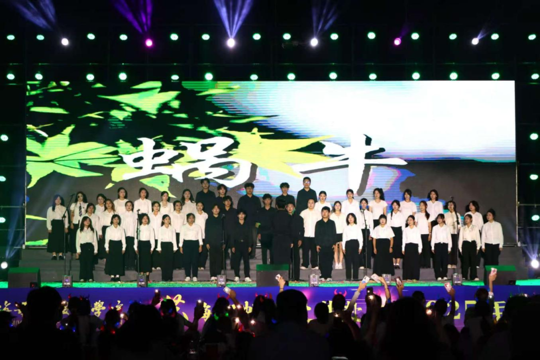 合唱节目《蜗牛》 夜色渐浓,晚会落下帷幕,但真挚的情谊与美好的瞬间,永远镌刻在每个人心中。愿学子们在新的征程上不忘初心,乘风破浪,一路繁花。祝2022级学子们赴京顺利!(汪乐希、高泽娅/摄)