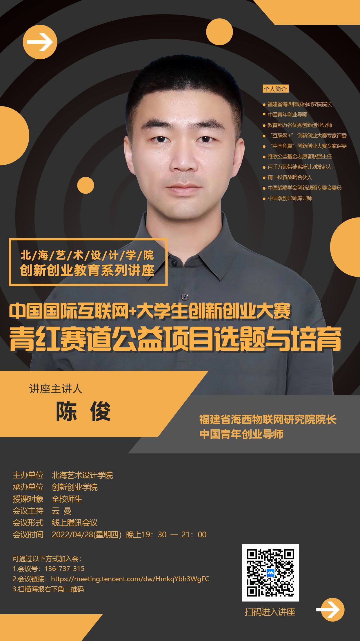 讲座预告 | 陈俊教授《中国国际互联网+大学生创新创业大赛 青红赛道公益项目选题与培育》