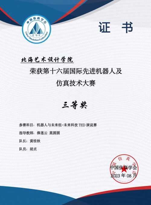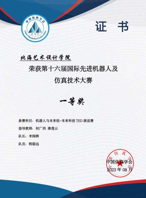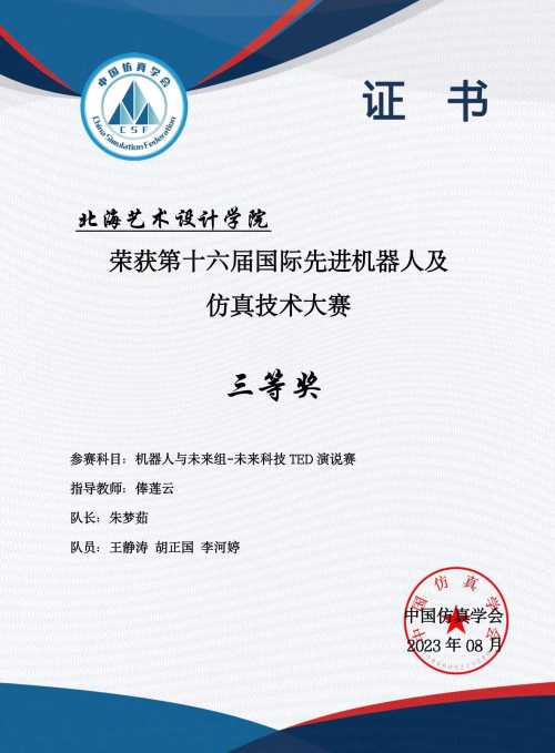 2023年3月在江苏太仓,由国际先进机器人及仿真技术大赛组委会举办的国际先进机器人及仿真技术大赛正式开赛。由我院哲学、汉语言文学专业学生李闻晖、程聪远、黄桂秋、胡贞、朱梦茹、王静涛、胡正国、李河婷组成的北海艺术设计学院代表队,在青年教师俸莲云、何广西、莫圆圆的指导下,取得一等奖一项,三等奖两项的好成绩,为我院师生首次在此类大赛中获奖。