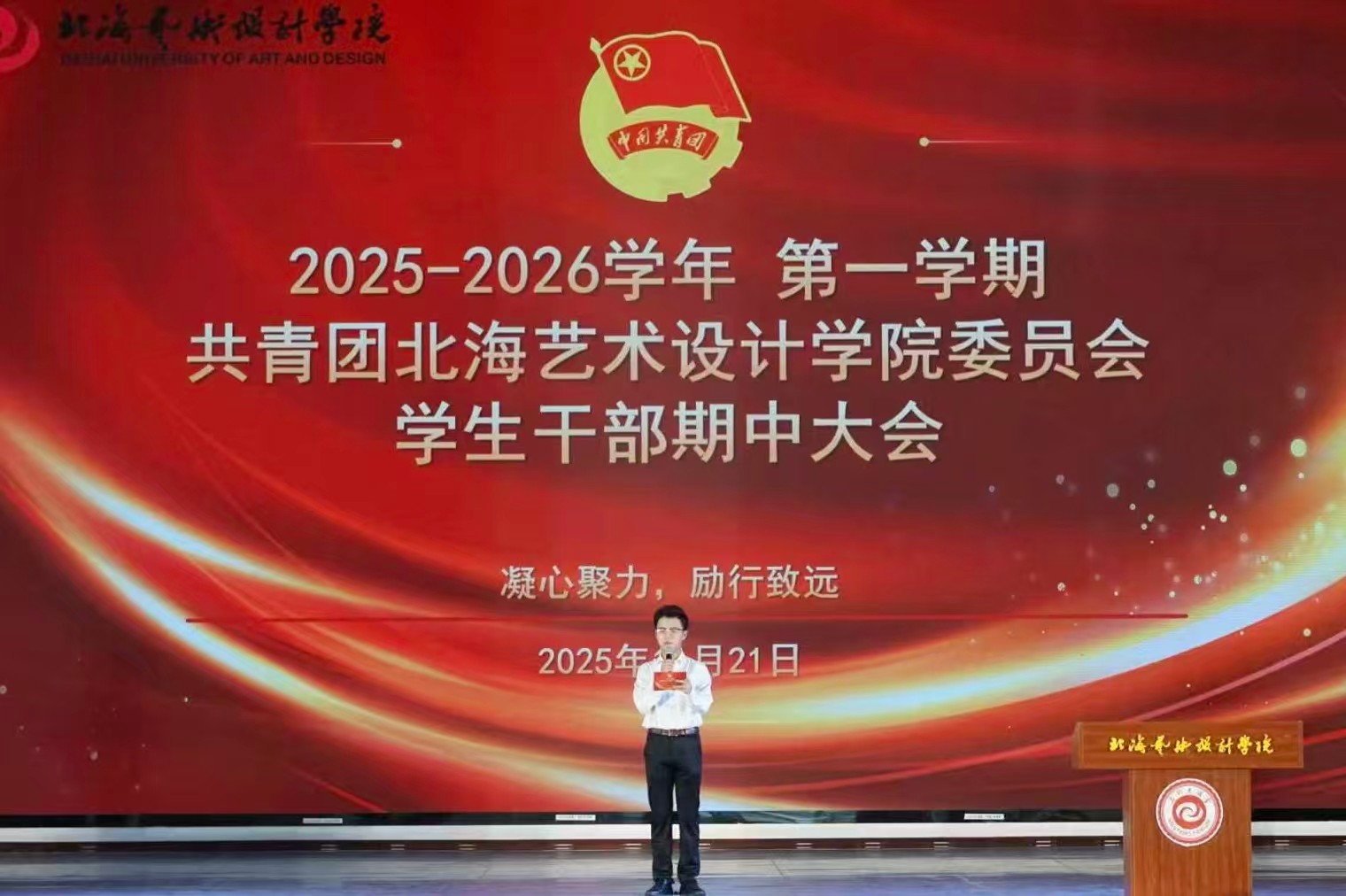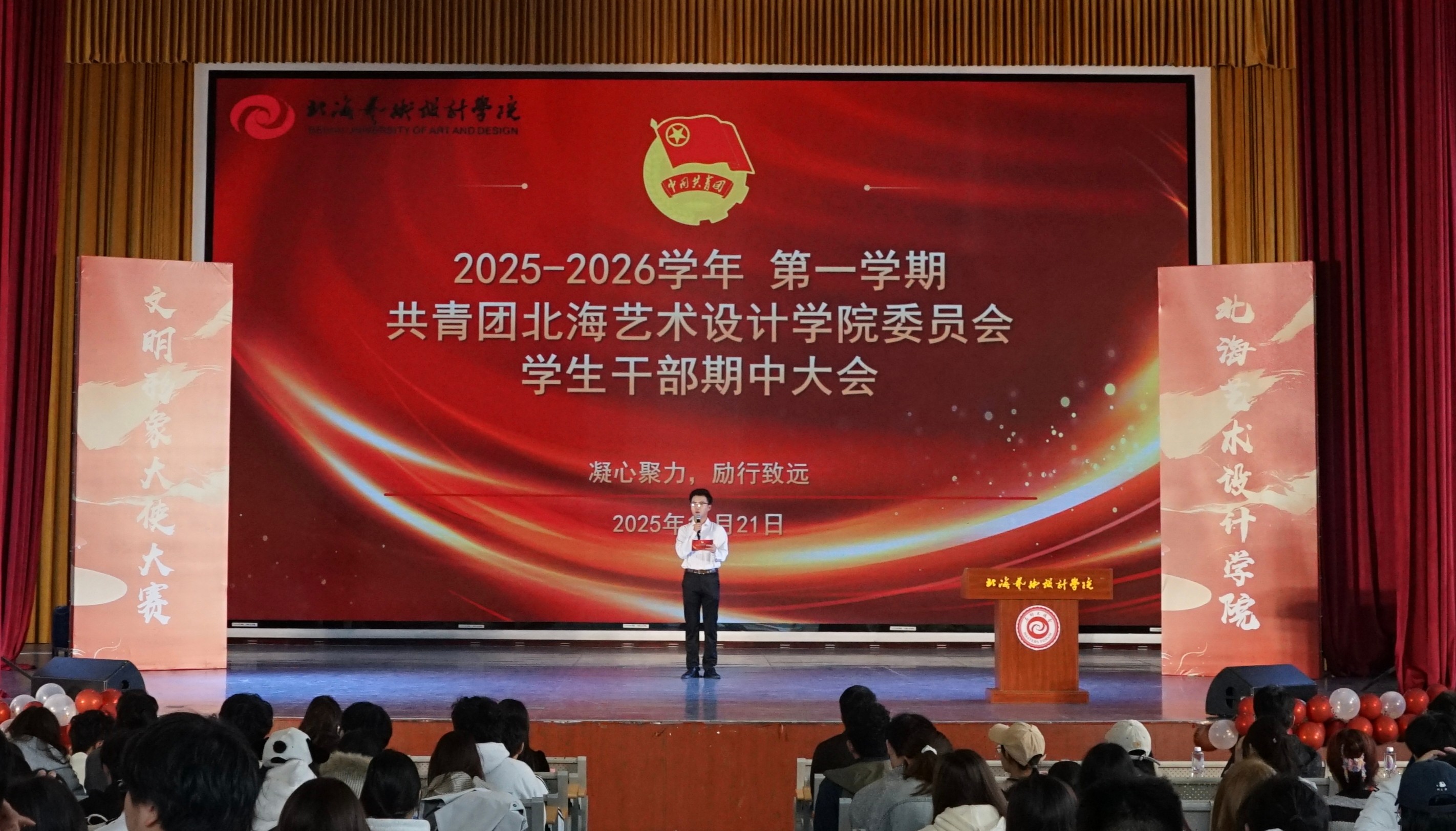 为提升学生干部业务能力和工作效率,加强对新成员的指导,我校团委各学生组织于11月21日在西区大礼堂开展2025——2026学年,第一学期共青团北海艺术设计学院委员会学生干部期中大会。出席本次会议的有团委书记唐良春,以及校团委领导老师们。