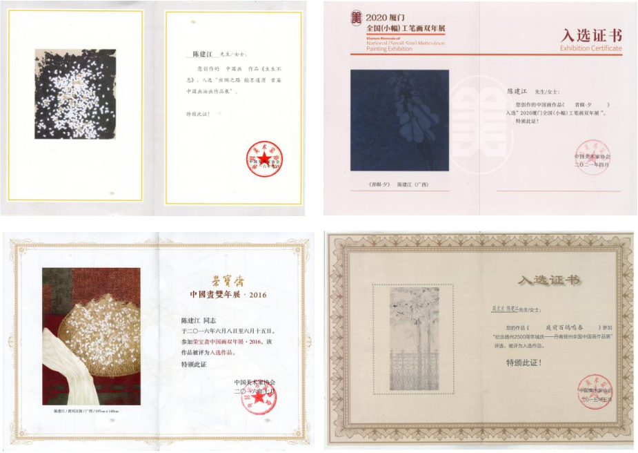笃志科研,潜心创作。创作之路,艰辛而寂寥,需要反复实践,逐渐积累。作为青年教师,陈建江老师毫无疑问是一名勤劳的“艺海探索者”。他于2016年,即获得了中国美术家协会会员。这得益于他多年的努力积淀和参展、获奖的阅历,在广西艺术学院求学期间,已多次参加全国性展览并获奖。2015年入职北海艺术设计学院,一直从事美术基础和国画专业课程教学。繁忙的教学工作和成家立业后的生活琐碎并没有影响他艺术创作的步伐,近几年不乏有佳作诞生,如:2020年,参加中国美术家协会举办的“2020厦门(小幅)工笔画作品展”入选的作品《青暝·夕》;2022年入选“2022第二届广西工笔画大展”的作品《一岁一枯荣》;2015年,入选全国中国画作品展,并被评为“优秀作品”的作品《悲鸿精神》等。2015年至今,各级各类展览入选、获奖等,共计12项。