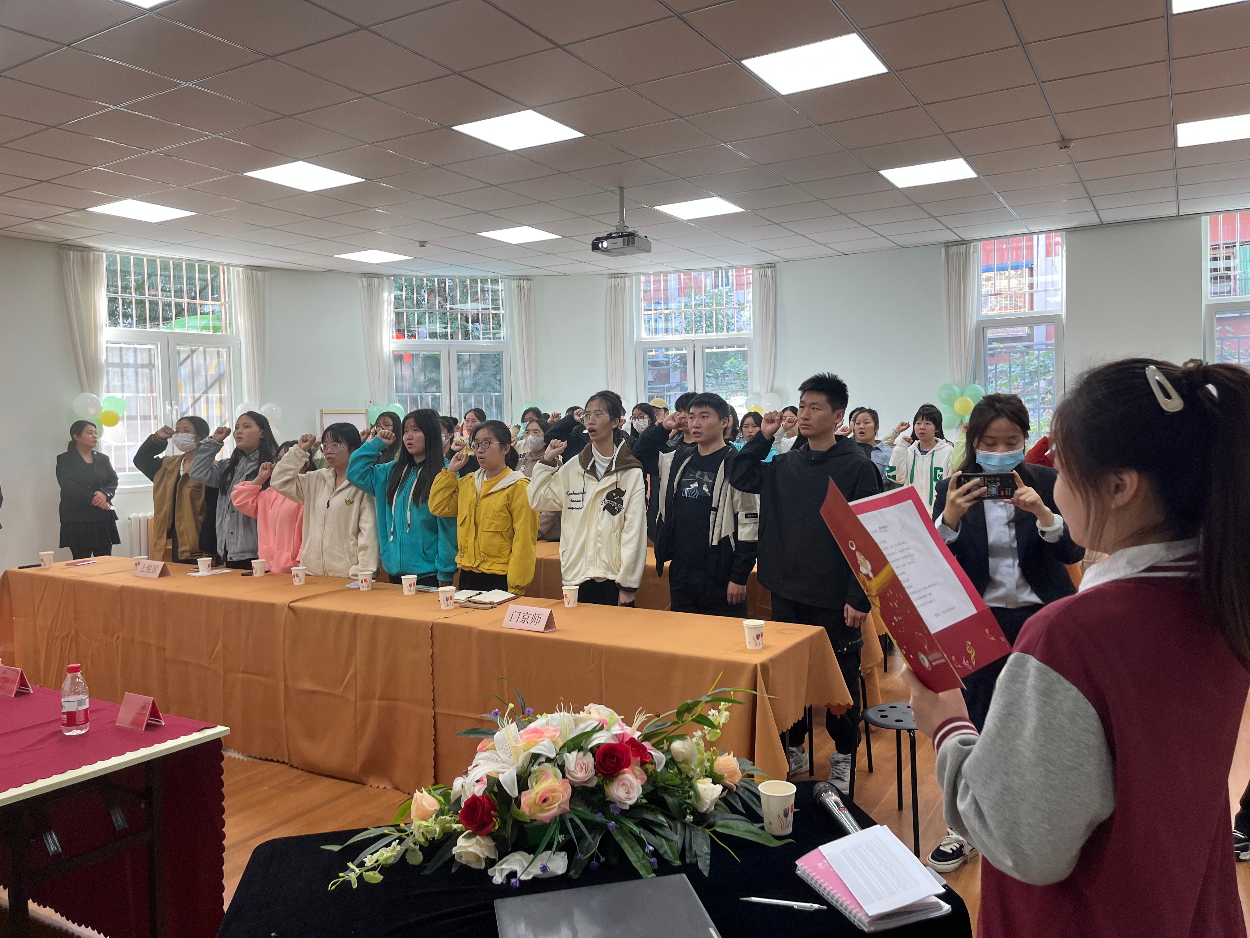会议最后由京师德培教育集团朝阳区幸福天使幼儿园教师代表、人文教育学院学前教育专业2022届毕业生孙灿与2020级学前教育专业学生一同宣读入职誓词