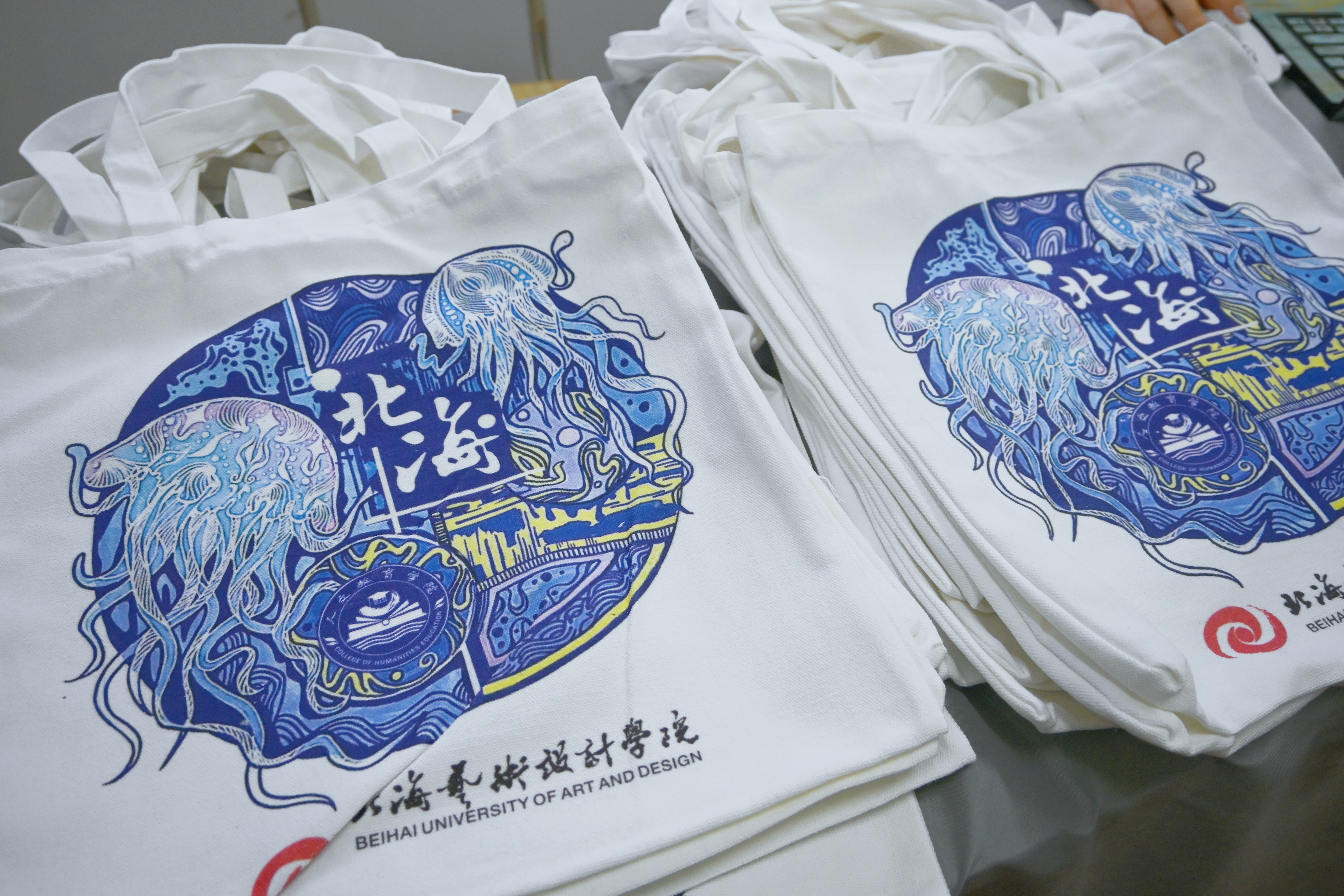 在本次主题活动举办前,我院分团委认真组织了帆布包的设计和制作。帆布包的设计主要以北海本地的海浪,水母,水草为创作灵感并运用柔和的线条加以创作,主色调采用蓝色和黄色,用以突出北海海洋文化特色,以及我校校训“道德”和人文教育学院“以文化人”的教育理念,取名“艺海共生”。两只水母共同生长在北海这片海洋里,被富饶的海洋资源孕育,向阳而生,北艺学子犹如两只水母,在北艺“道德”校训和浓厚的学习氛围中接受熏陶,在老师的谆谆教导下不忘初心,砥砺前行!
