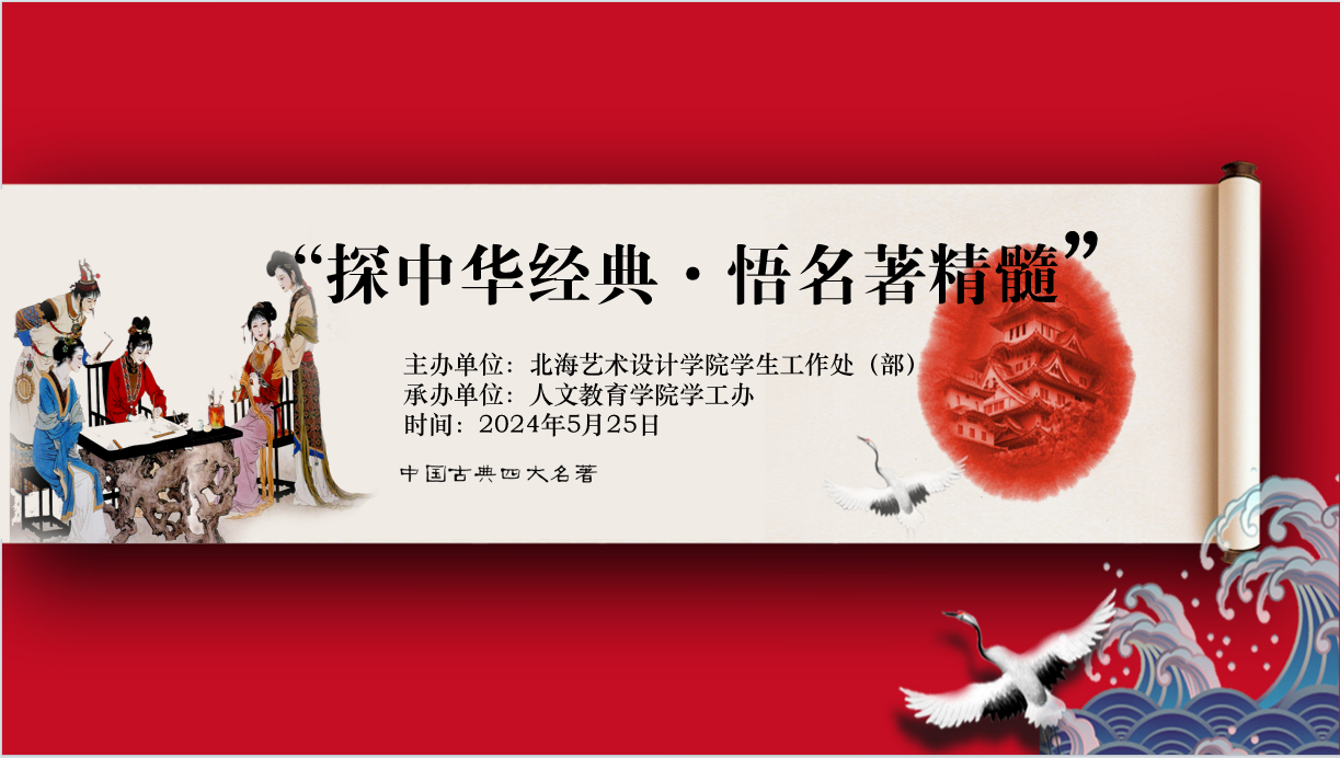 为全面贯彻党的二十大精神,积极响应国家文化强国建设的号召,深入推进全民阅读活动。北海艺术设计学院学生工作处(部)主办,人文教育学院承办的“探中华经典 · 悟名著精髓”决赛于2024年5月25日在图书馆多功能厅举办。党委副书记刘承初、学工处处长班媚、人文教育学院副院长李水亮、第四党总支副书记邓欢、哲学教研室主任覃传茵以及汉语言教研室副主任姜玮等领导和嘉宾莅临比赛现场。
