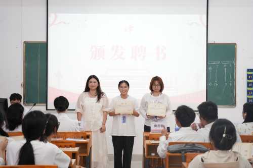教师代表给学生干部颁发聘书   陈美霖老师为先进个人颁发证书