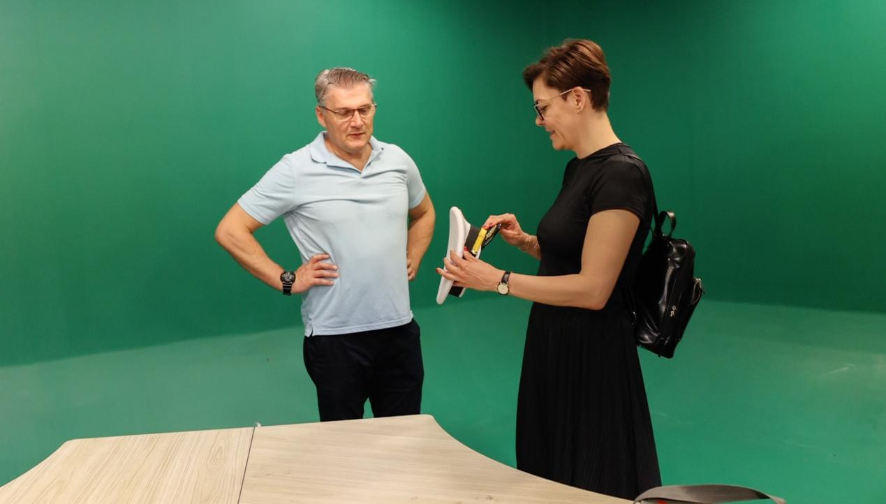 在参观过程中,我院教师向匈牙利专家团详细介绍了动画与传媒学院的专业设置与特色。从王钢工作室到高亮工作室,从播音演播室到动画动作捕捉实验室,从VR实验室再到尖端的3D打印室。两位教授对学院的专业教学环境和设备表示了高度的赞赏,特别是参观高速渲染实验室时,李剑阁主任详细解读了其在影视制作中的关键作用,并指出这样的技术设备在专业的电影制作公司中才能见到,让匈牙利专家团深刻感受到了我院在教学技术上的先进性和前瞻性。