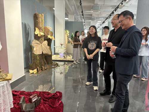 在最后的观展互动环节,现场气氛热烈非凡。各组参展学生们满怀热忱,纷纷化身为“作品代言人”,他们以自信且专业的姿态,将自己小组在创作过程中的奇思妙想、攻克的重重难关以及蕴含其中的设计理念娓娓道来,生动地展现出作品背后的故事,力求让领导、嘉宾和老师们全方位领略作品的魅力。与此同时,他们还展现出了极高的学习热情与谦逊态度,专注地聆听着领导、嘉宾和老师们提出的宝贵指导意见。整个互动环节,思想碰撞出的火花四处绽放,为这场美陈展增添了别样的精彩与深度。