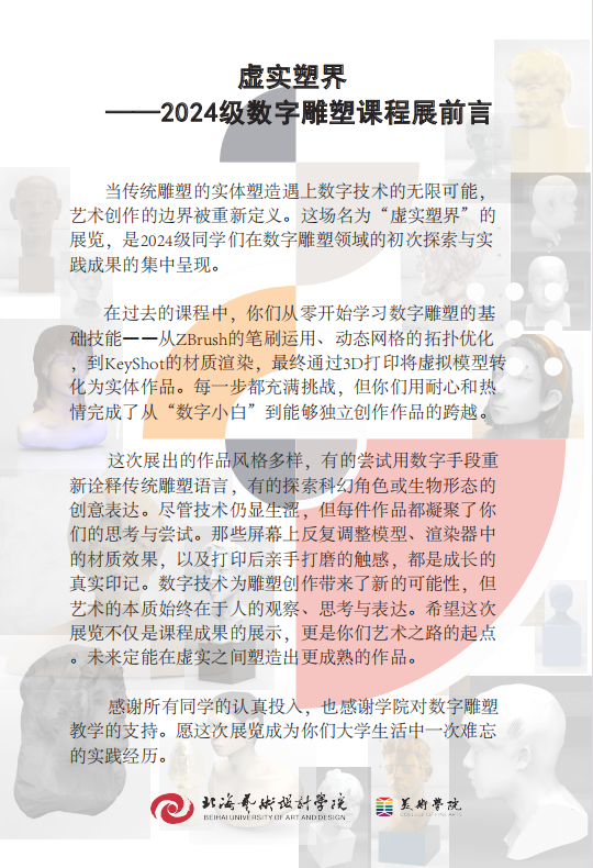 通过本次展览,不仅让雕塑专业一年级的学生们深化了对数字雕塑技术的理解和应用,更激发了他们往后三年专业学习的创新思维和艺术潜能,为学院培养具有国际视野和创新能力的新时代艺术人才奠定了坚实基础。同时,此次展览不仅展示了学生在数字雕塑技术方面的实际应用能力,也为相关企业提供了了解学院教学成果和学生才华的机会。为校企合作搭建了一个交流与合作的平台,有助于校企双方在人才培养、技术创新等方面实现资源共享和优势互补,为学生提供更多实践机会和就业渠道,促进教育与产业的深度融合,为数字雕塑领域的发展注入新的活力。