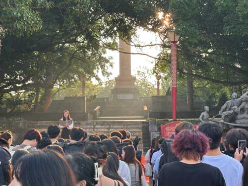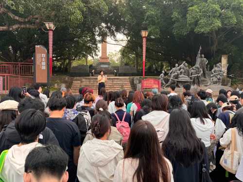 与此同时,学院组织同学们前往涠洲岛红色旅游景区,这片位于岛湾背山坡的革命历史纪念地,见证了岛屿的烽火岁月。在庄严肃穆的红色广场上,学生们参与了一场“红色革命历史现场教学”。马克思主义学院专任教师李妙燕、文姣丽通过讲授,引导学生们探索“革命历史”的深厚内涵,实现了一次深刻的“思政教育”与艺术实践的融合。