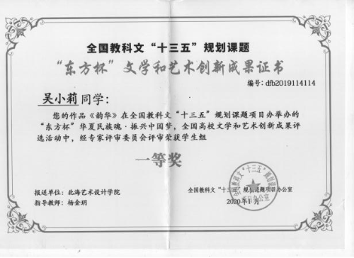 环境艺术学院师生积极参与各项专业竞赛,成绩突出。在本次“东方杯”文学和艺术创新成果展成绩喜人。本次成果展是由全国教科文“十三五”规划课题项目办公室主办的“东方杯”华夏民族魂·振兴中国梦活动。我院报送的作品在文学和艺术创新成果中斩获集体成果奖、全国高校艺术教育先进单位,教师组一等奖6个、二等奖1个、教研成果一等奖3个、教研成果二等奖2个、优秀指导教师奖3个、优秀组织教师奖2个,学生组一等奖40个、 二等奖30个、三等奖3个的优异成绩。
