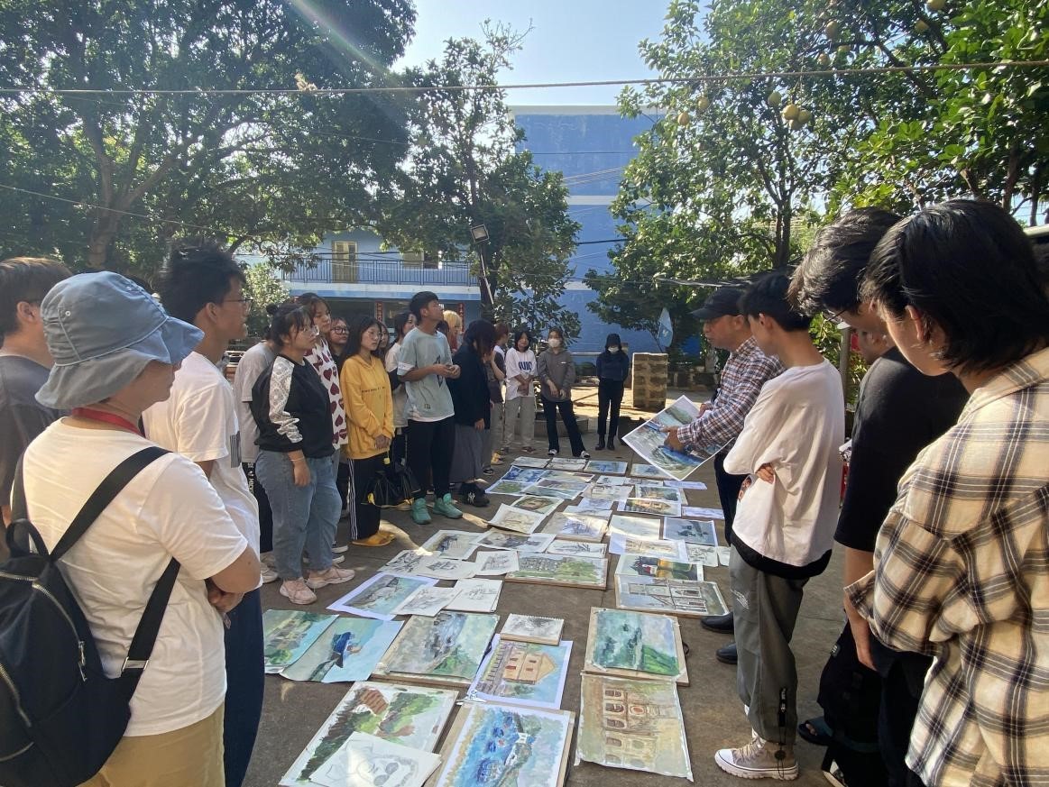 师生们每到一地,认真地根据现场环境进行写生创作,相互观摩画作,交流作画心得,老师们对同学们的作品一一进行讲解,对同学们出现的疑惑、问题进行解答,并传授给同学们在画工上的经验、技法。