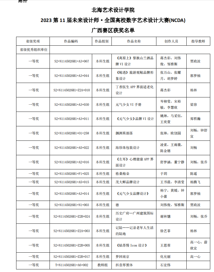 我院师生在2023第11届未来设计师·全国高校数字艺术设计大赛NCDA)中取得优异成绩共荣获全国赛区一等奖2项、二等奖4项、三等奖5项;广西区赛一等奖17项、二等奖20项、三等奖28项,学校荣获省级优秀组织单位”奖