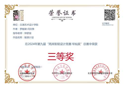 两岸新锐设计竞赛·华灿奖由中国高等教育学会、中华中山文化交流协会、北京歌华传媒集团有限责任公司主办的第九届两岸新锐设计竞赛·华灿奖(以下简称华灿奖)自2024年4月启动以来,经过5个月的作品征集,共收到7万余参赛作品。经校赛、赛区赛评审,总赛网络评审、现场评审及公示,本届华灿奖共评选出总赛获奖作品2749项。