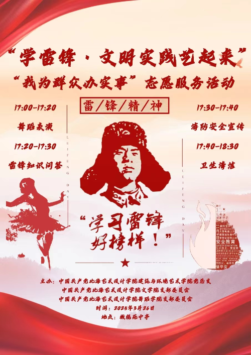 3 月 26 日下午 5 点,文学院党支部、建筑与环境艺术学院党总支与舞蹈学院党支部走进橄榄苑社区共同举办了一场旨在弘扬雷锋精神,践行文明理念的“学雷锋・文明实践艺起来”志愿服务活动。此次活动吸引了社区居民们的热情参与,在小区内营造出浓厚的志愿服务氛围。