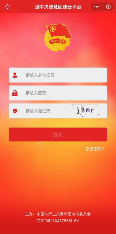 2.登录全国“智慧团建”系统,用户名为本人身份证号,初始密码为身份证后8位。如果忘记密码或密码错误,可以找本支部的管理员(一般为团支书)发放密码重置验证码,然后在登录页面点击忘记密码完成相关操作。