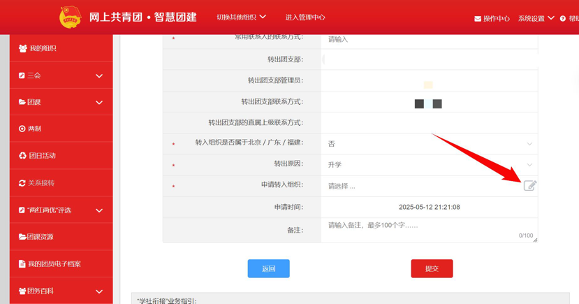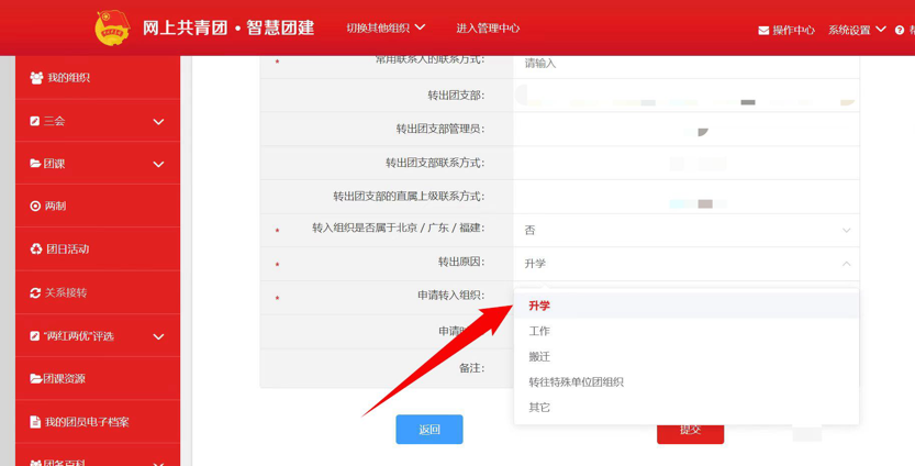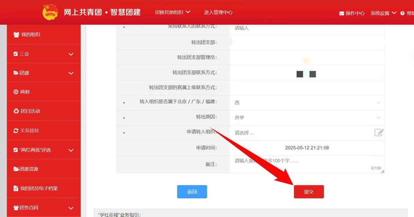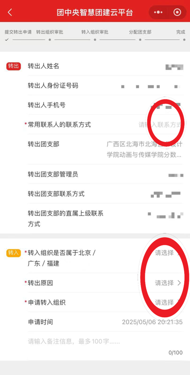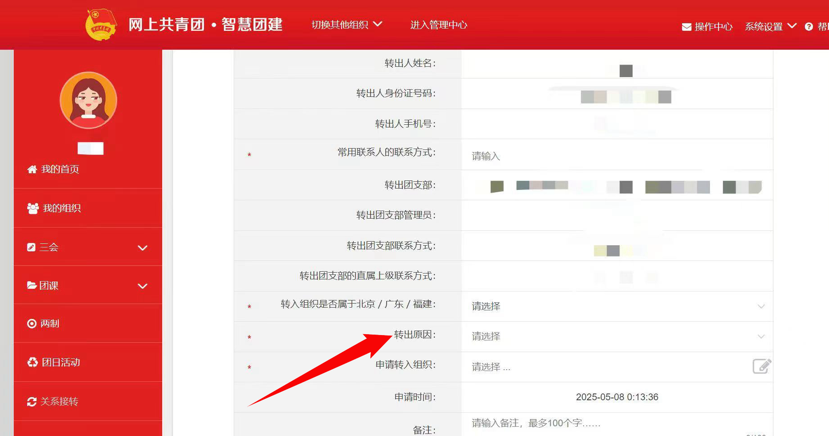 4.选择转出团支部、转出人姓名、转入组织是否属于北京/广东/福建、转出原因和转入组织等。提交申请,在转入组织的管理员审批同意后,转接完成。
