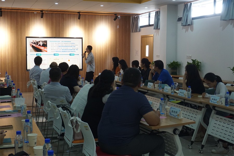 活动上午,六所高校心理健康教育教学团队在广西医科大学武鸣校区心理健康教育与咨询中心共同研讨高校心理危机干预工作实施办法,交流“心理健康教育互助共建”工作计划,各参会高校分别分享了在工作过程中遇到的困惑和难题,并互相学习关于心理危机干预的先进理念和工作方法。我校刘玲花副处长就本校心理健康教育相关工作情况进行了介绍说明。随后,参会高校老师实地走访了该校的心理健康教育与咨询中心,分别参观了团体心理沙盘室、综合训练室、学业发展辅导室、心理剧场和积极心理体验室等场地。
