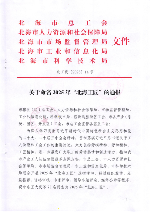 据悉,“北海工匠”评选由北海市总工会联合多部门每三年举办一次,旨在挖掘扎根一线、技术精湛、贡献突出的技能人才。2025年评选共收到全市120余家单位推荐材料,经资格审查、专家评审、社会公示等环节,最终20人获此殊荣,涵盖高端制造、文化创意、公共服务等领域。