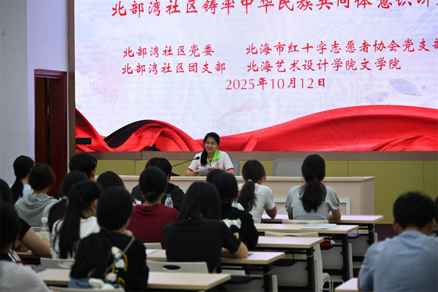随后,北部湾社区党委书记张燕向志愿者们开展铸牢中华民族共同体意识讲座。她结合社区民族工作实际,从历史渊源、政策背景、现实意义三个维度,阐释“中华民族一家亲,同心共筑中国梦”的深刻内涵,强调新时代青年需自觉维护民族团结大局,以实际行动促进各民族交往交流交融;并以“石榴籽紧紧抱在一起”为喻,生动说明56个民族需紧密团结、共绘中华同心圆。