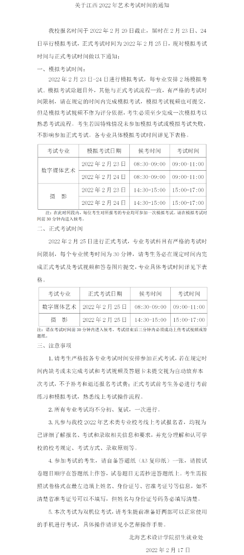 关于江西2022年艺术校考时间的通知
