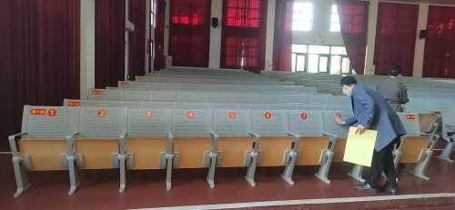 设备与信息处老师给礼堂780个座位换上新标签,新座位更显得有序规范。